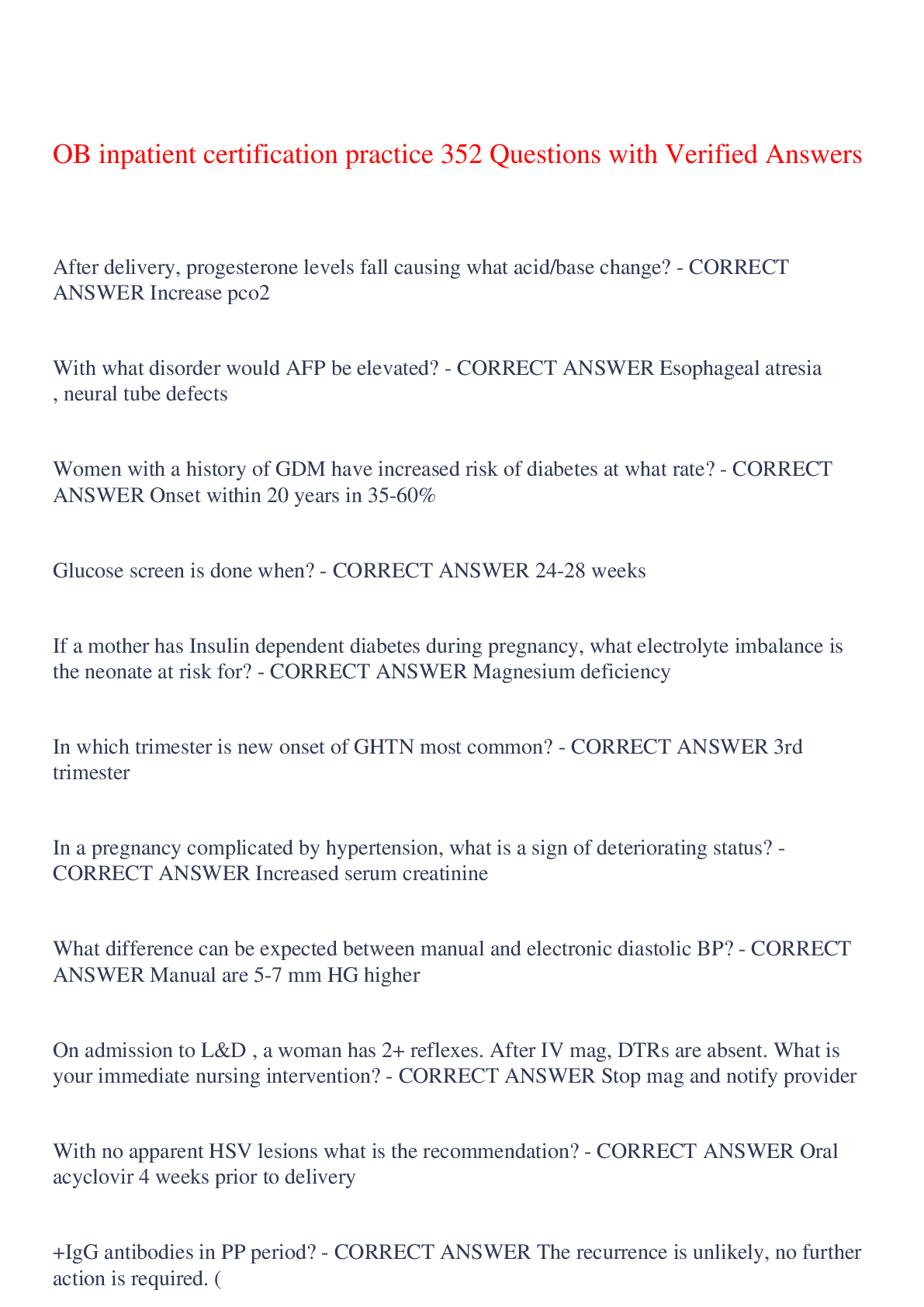 *NURSING> EXAM > OB inpatient certification practice 352 Questions with Verified Answers,100% CORRECT (All)