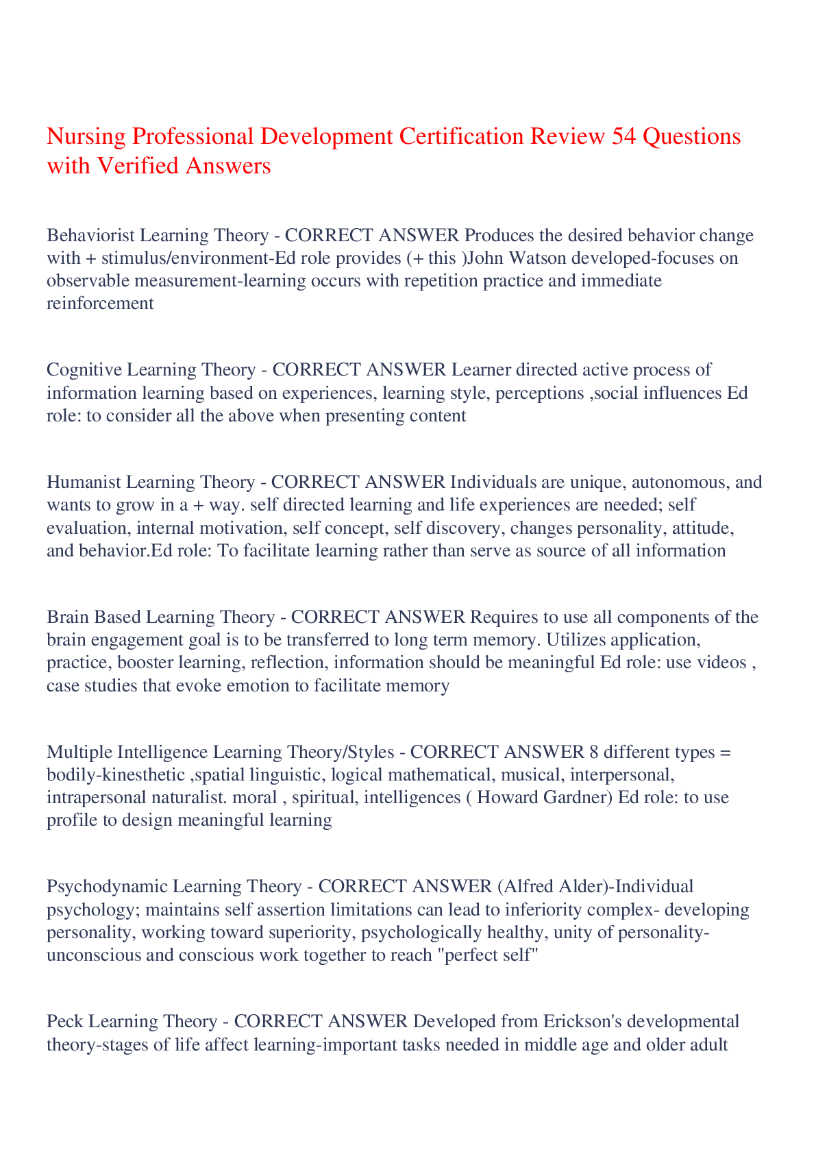 *NURSING> EXAM > Nursing Professional Development Certification Review 54 Questions with Verified Answers,100% CORRECT (All)