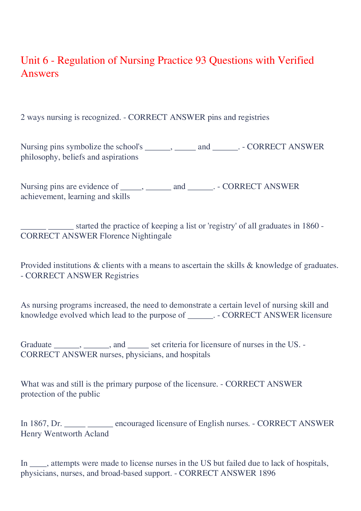 Unit 6 - Regulation of Nursing Practice 93 Questions with Verified Answers 2 ways nursing is recognized. - CORRECT ANSWER pins and registries Nursing pins symbolize the school's ______, _____...