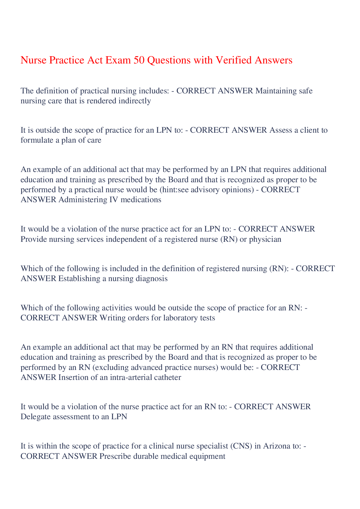 Nurse Practice Act Exam 65 Questions with Verified Answers T/F: the nurse practice act is different in every state - CORRECT ANSWER True Nurse practice act: it gives us rules and laws so that we...