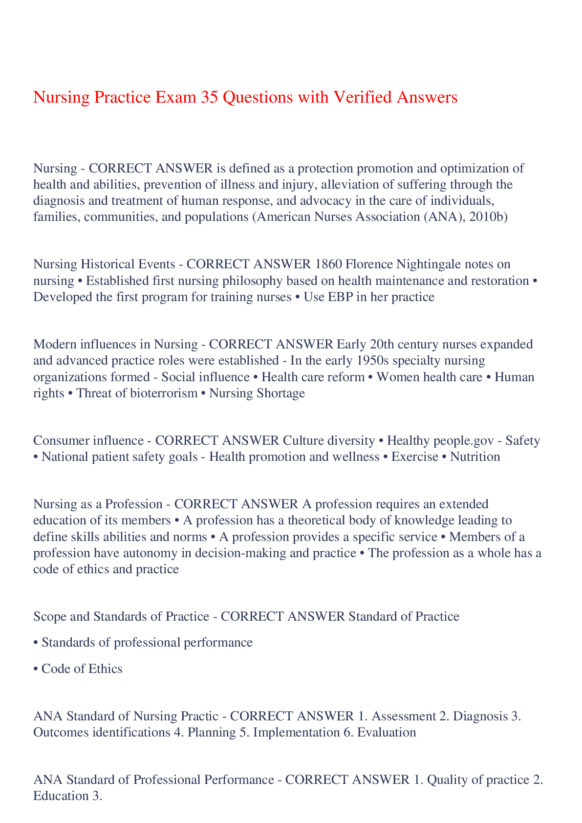 Nursing Practice Exam 35 Questions with Verified Answers Nursing - CORRECT ANSWER is defined as a protection promotion and optimization of health and abilities, prevention of illness and injury,...