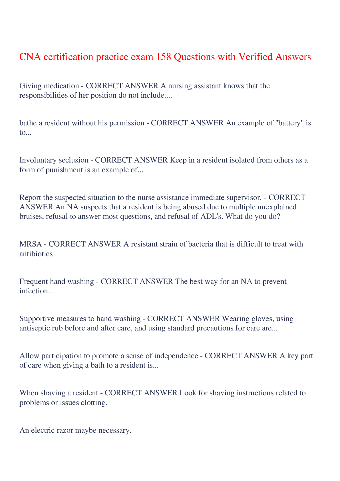 CNA certification practice exam 158 Questions with Verified Answers Giving medication - CORRECT ANSWER A nursing assistant knows that the responsibilities of her position do not include.... bath...