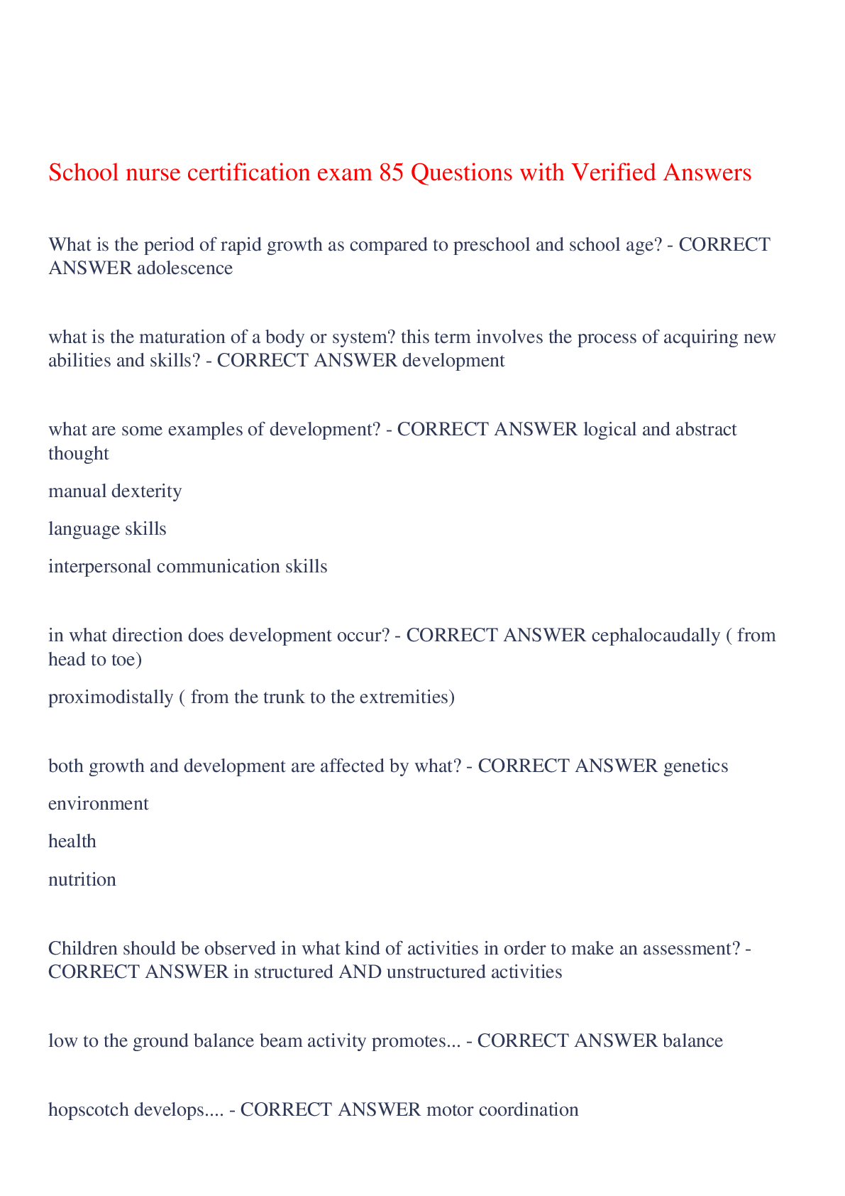 School nurse certification exam 85 Questions with Verified Answers What is the period of rapid growth as compared to preschool and school age? - CORRECT ANSWER adolescence what is the maturation...