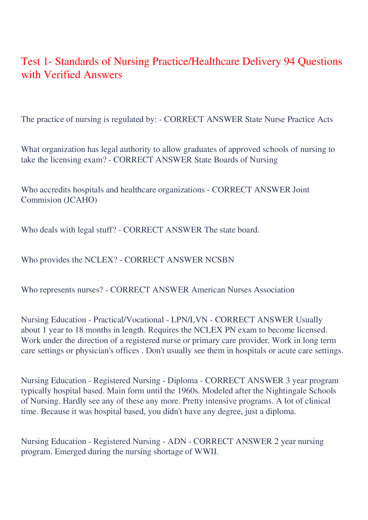 Test 1- Standards of Nursing Practice/Healthcare Delivery 94 Questions with Verified Answers The practice of nursing is regulated by: - CORRECT ANSWER State Nurse Practice Acts What organizati...