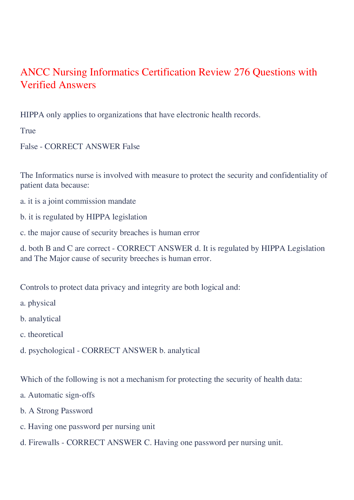 ANCC Nursing Informatics Certification Review 276 Questions with Verified Answers HIPPA only applies to organizations that have electronic health records. True False - CORRECT ANSWER False Th...