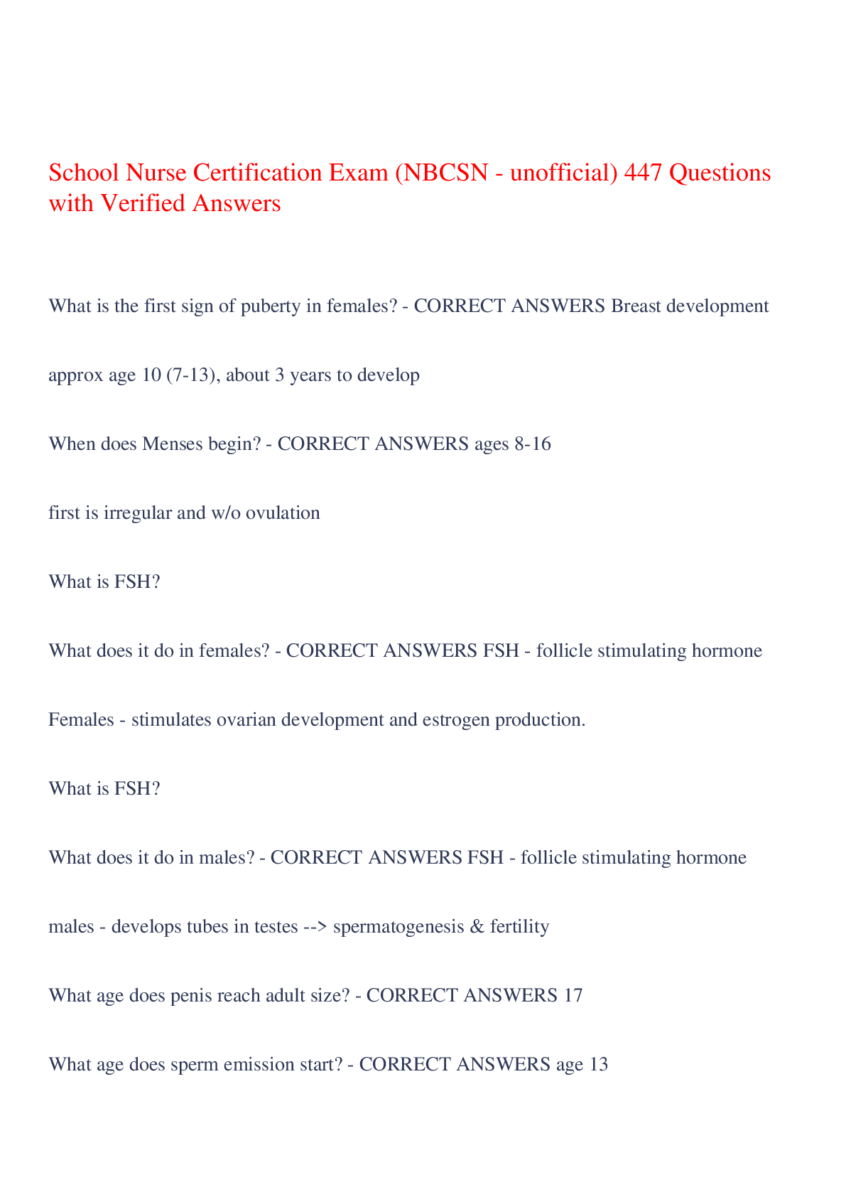 School Nurse Certification Exam (NBCSN - unofficial) 447 Questions with Verified Answers What is the first sign of puberty in females? - CORRECT ANSWERS Breast development approx age 10 (7-13)...