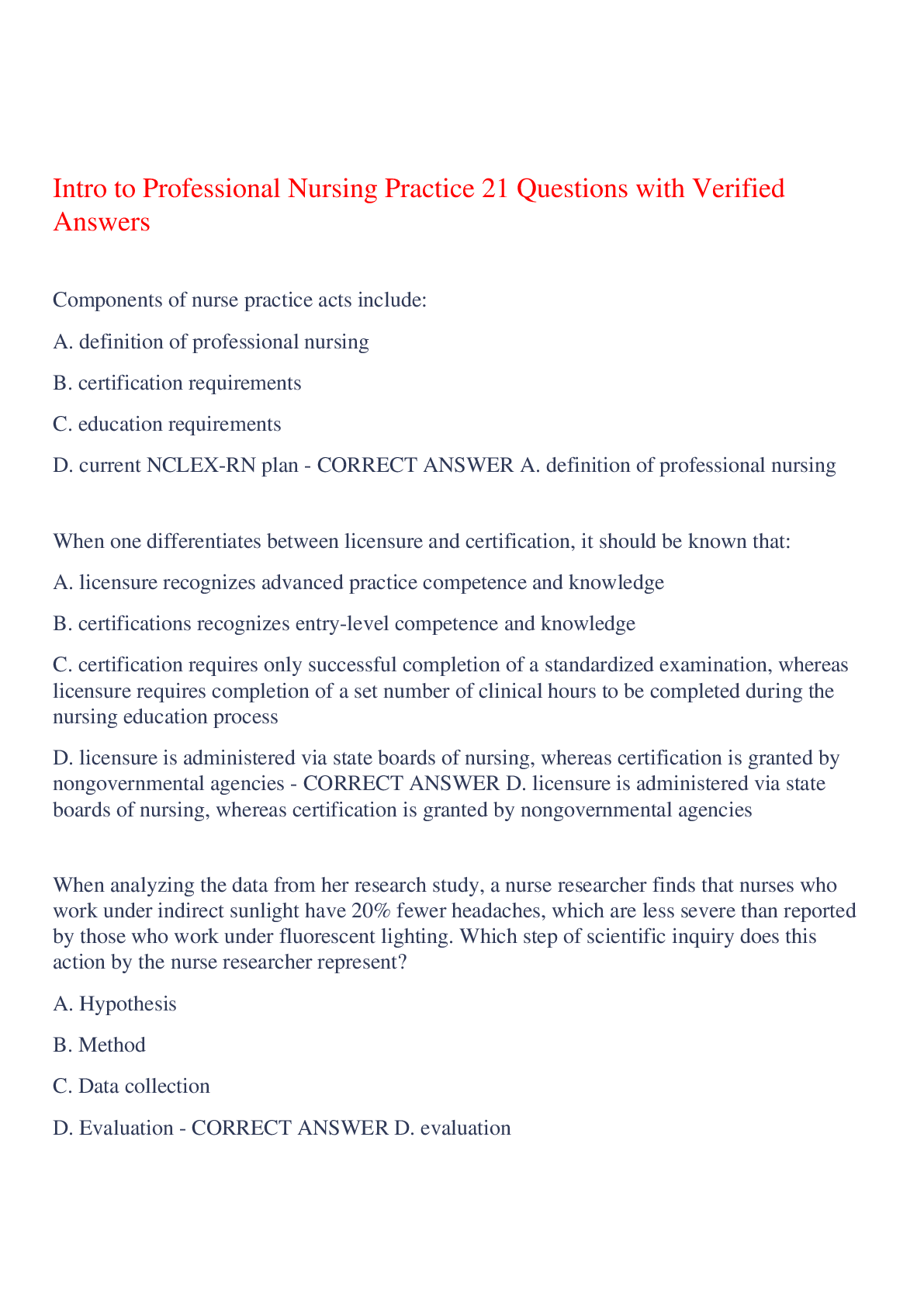 Intro to Professional Nursing Practice 21 Questions with Verified Answers Components of nurse practice acts include: A. definition of professional nursing B. certification requirements C. educ...