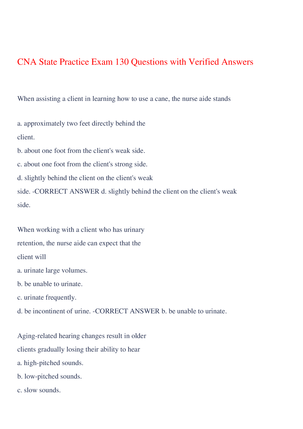 CNA State Practice Exam 130 Questions with Verified Answers When assisting a client in learning how to use a cane, the nurse aide stands a. approximately two feet directly behind the client....