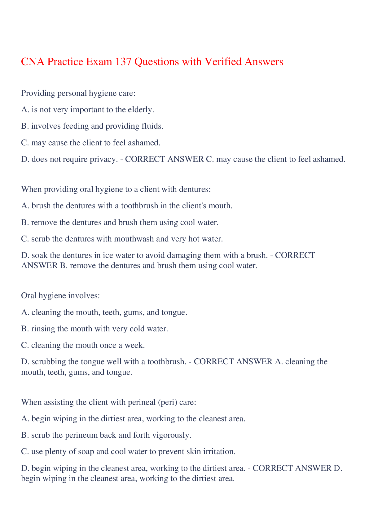CNA Practice Exam 137 Questions with Verified Answers Providing personal hygiene care: A. is not very important to the elderly. B. involves feeding and providing fluids. C. may cause the client...