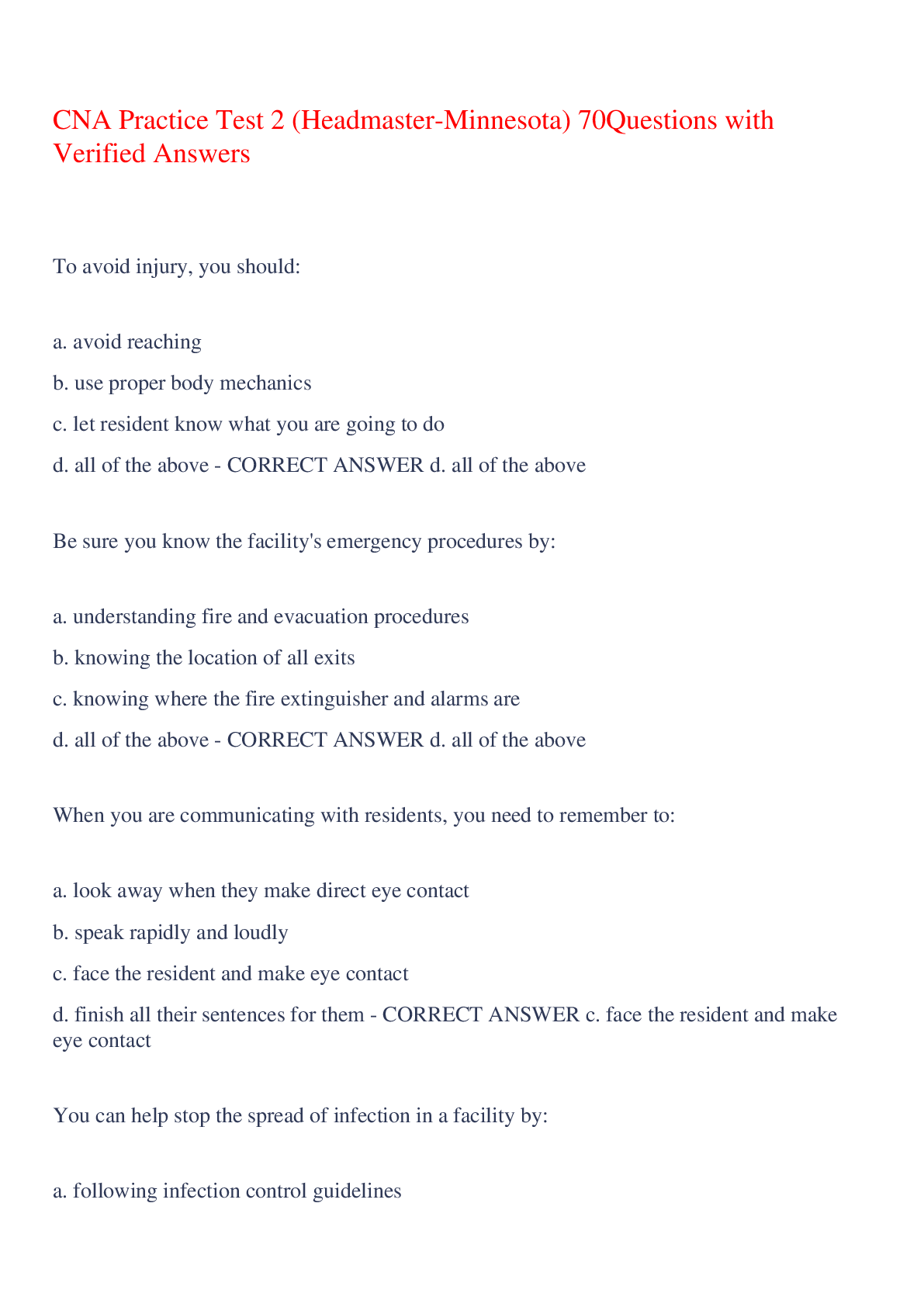 CNA Practice Test 2 (Headmaster-Minnesota) 70 Questions with Verified Answers To avoid injury, you should: a. avoid reaching b. use proper body mechanics c. let resident know what you are go...