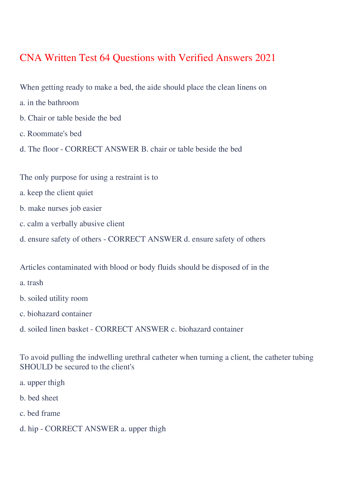 CNA Written Test 64 Questions with Verified Answers 2021 When getting ready to make a bed, the aide should place the clean linens on a. in the bathroom b. Chair or table beside the bed c. Roomm...