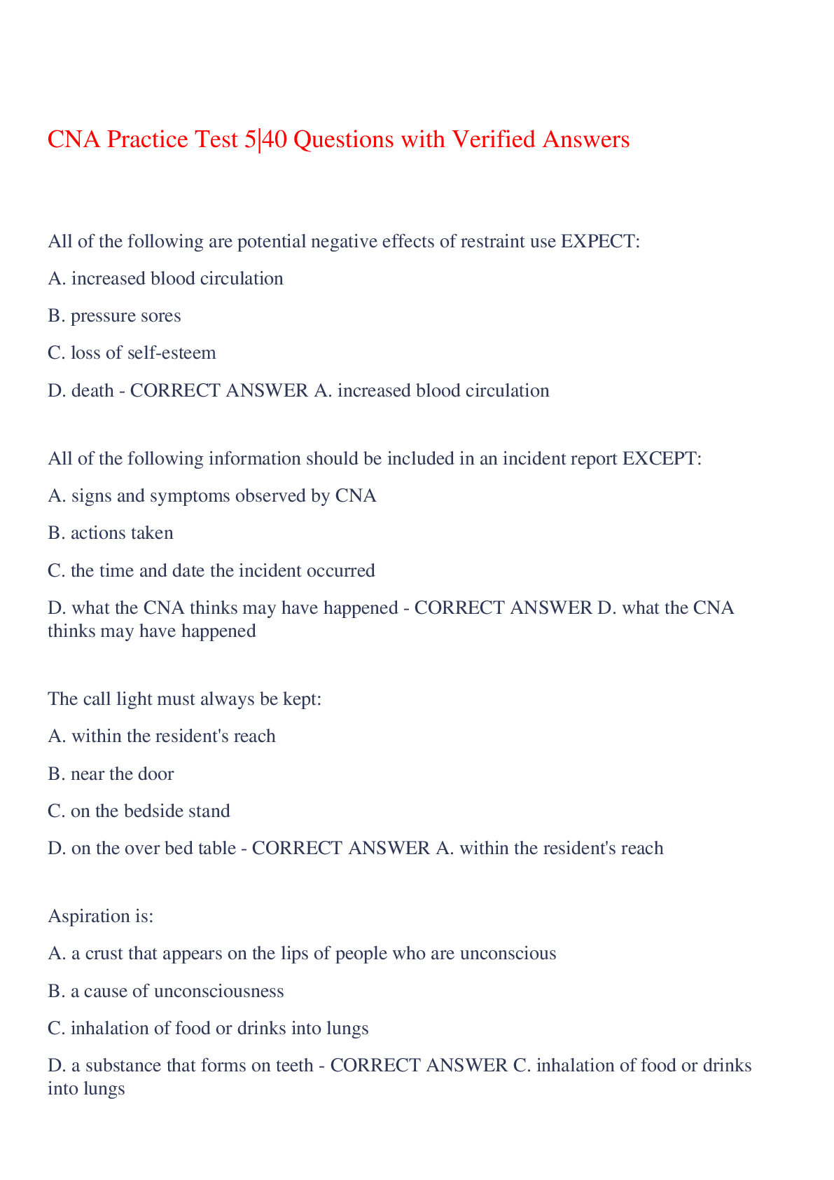 CNA Practice Test 5|40 Questions with Verified Answers All of the following are potential negative effects of restraint use EXPECT: A. increased blood circulation B. pressure sores C. loss of...