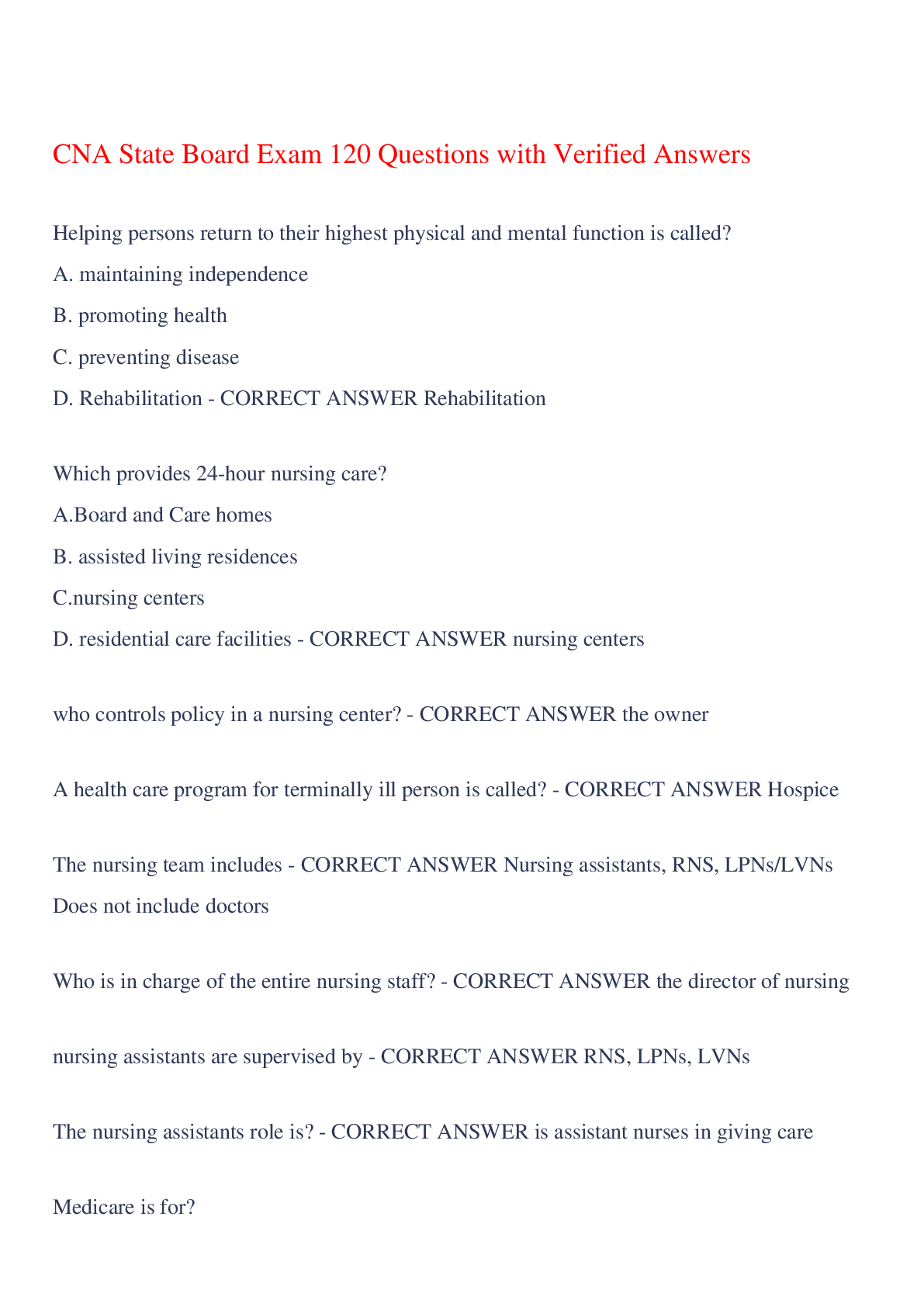 CNA State Board Exam 120 Questions with Verified Answers Helping persons return to their highest physical and mental function is called? A. maintaining independence B. promoting health C. preven...