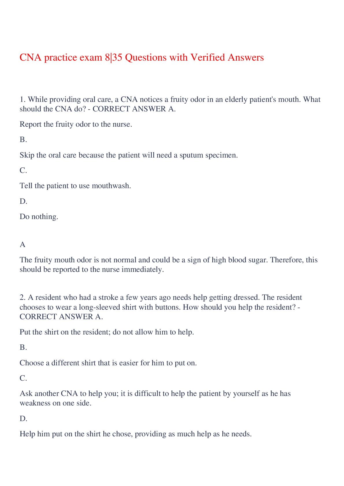 CNA practice exam 8|35 Questions with Verified Answers 1. While providing oral care, a CNA notices a fruity odor in an elderly patient's mouth. What should the CNA do? - CORRECT ANSWER A. Report...