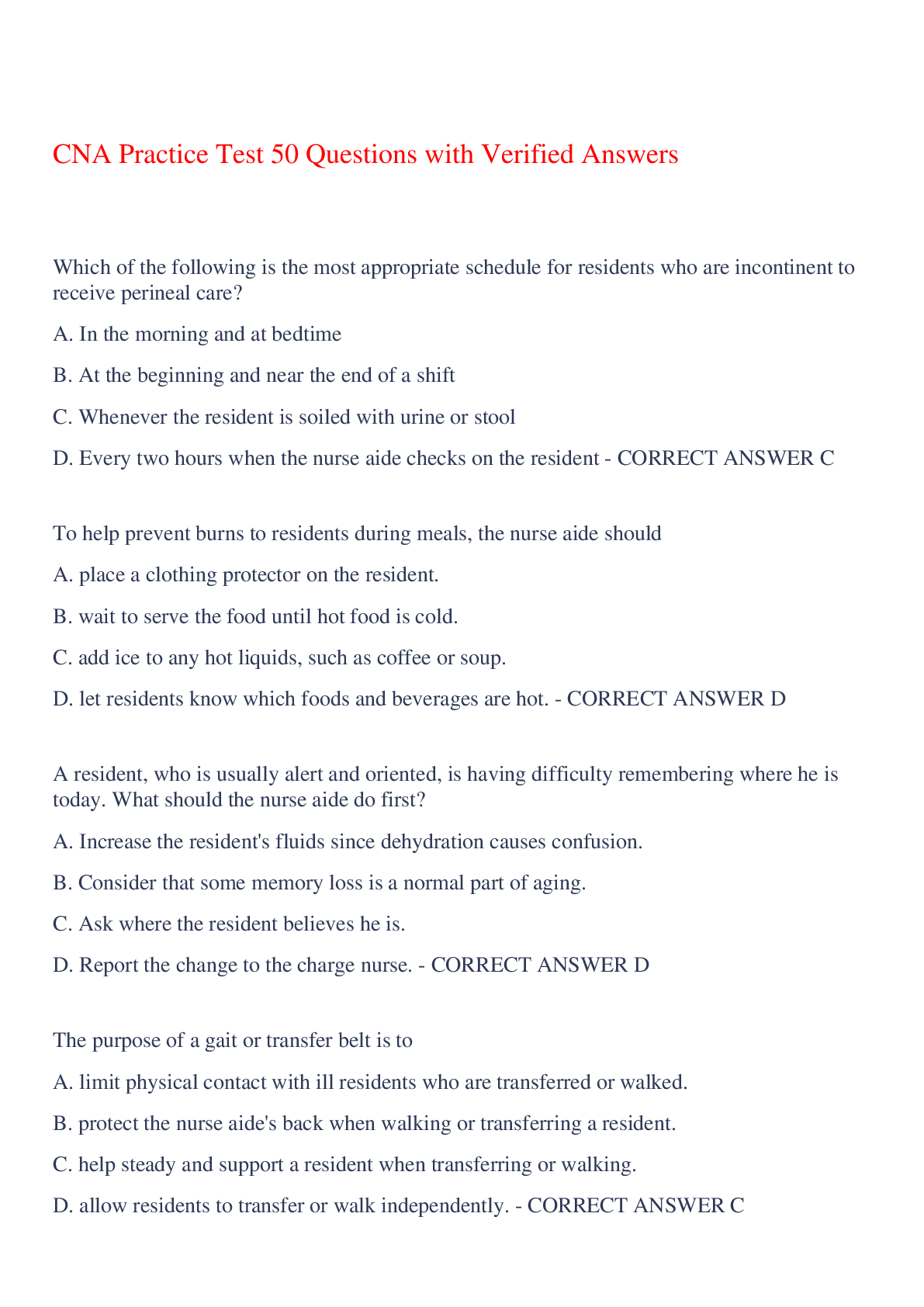 CNA Practice Test 50 Questions with Verified Answers Which of the following is the most appropriate schedule for residents who are incontinent to receive perineal care? A. In the morning and...