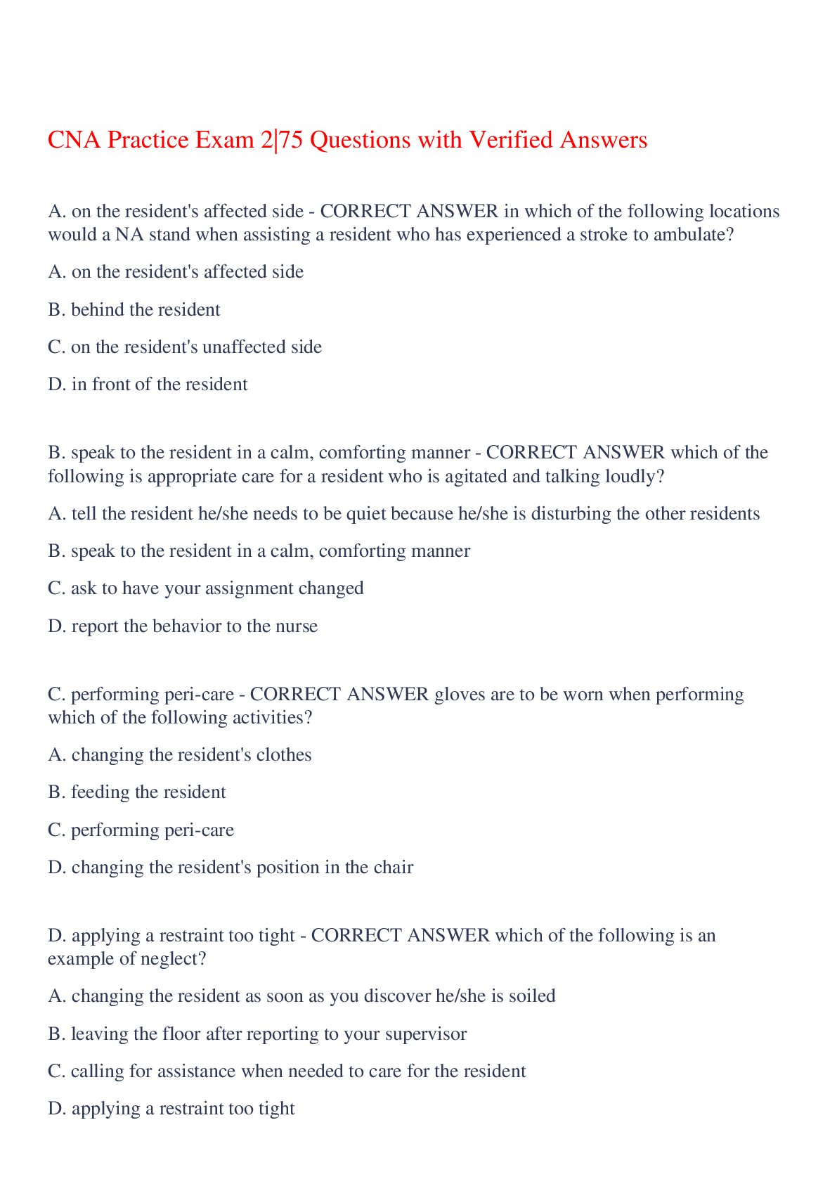 CNA Practice Exam 2|75 Questions with Verified Answers A. on the resident's affected side - CORRECT ANSWER in which of the following locations would a NA stand when assisting a resident who has exp...