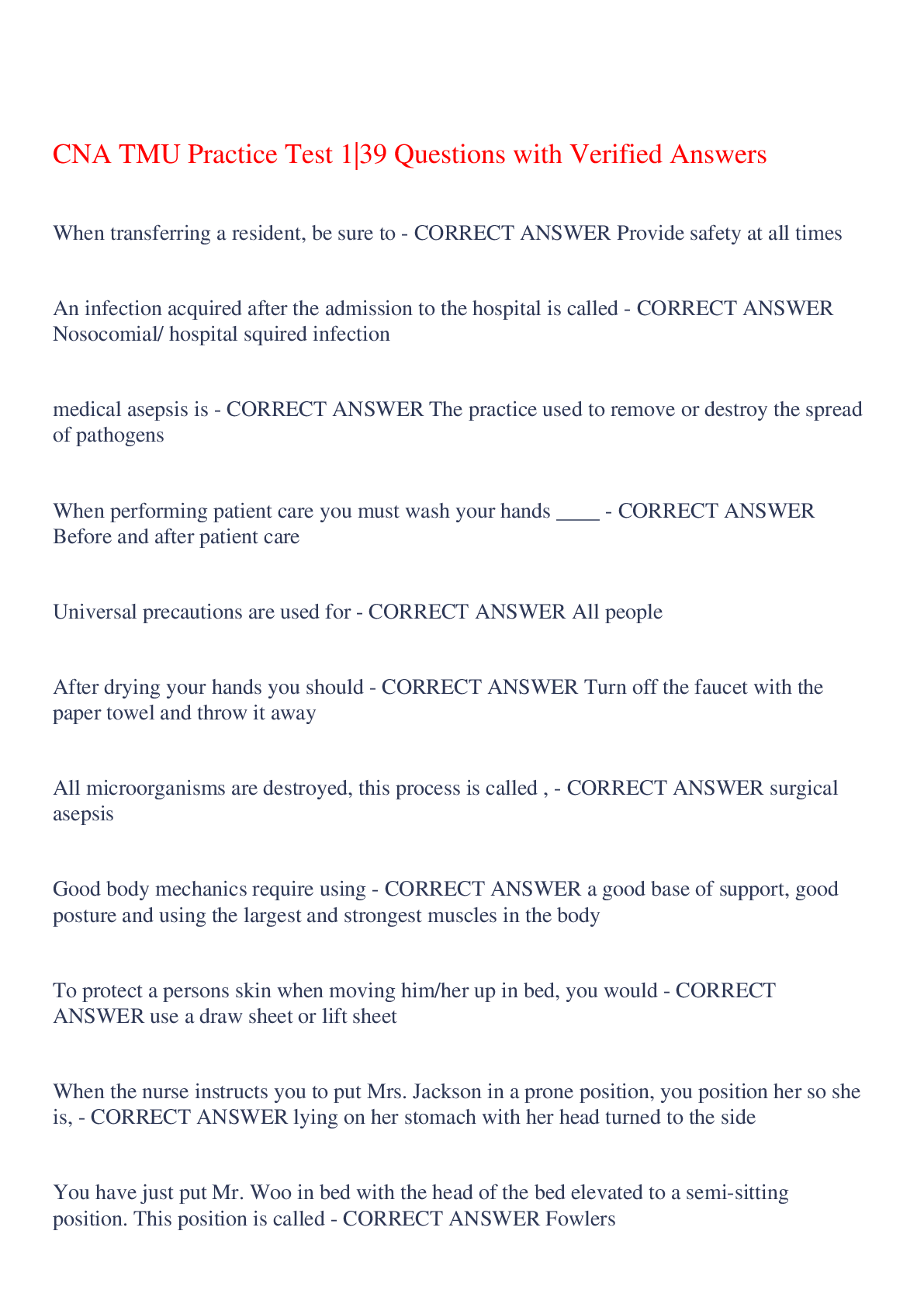CNA TMU Practice Test 1|39 Questions with Verified Answers When transferring a resident, be sure to - CORRECT ANSWER Provide safety at all times An infection acquired after the admission to the...