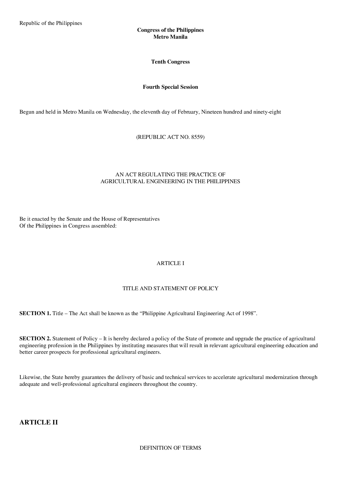 ARTICLE I TITLE AND STATEMENT OF POLICY SECTION 1. Title – The Act shall be known as the “Philippine Agricultural Engineering Act of 1998”. SECTION 2. Statement of Policy – It is hereby dec...