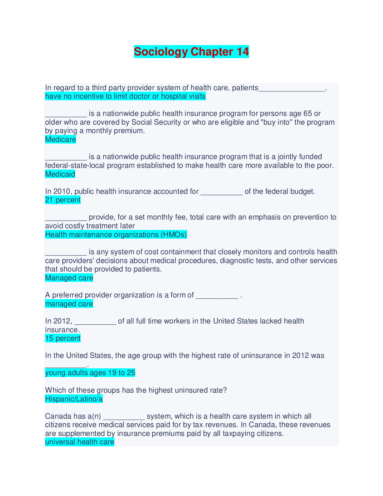 Sociology Chapter 14 - Questions and Answers In regard to a third party provider system of health care, patients________________. have no incentive to limit doctor or hospital visits __________ is a...