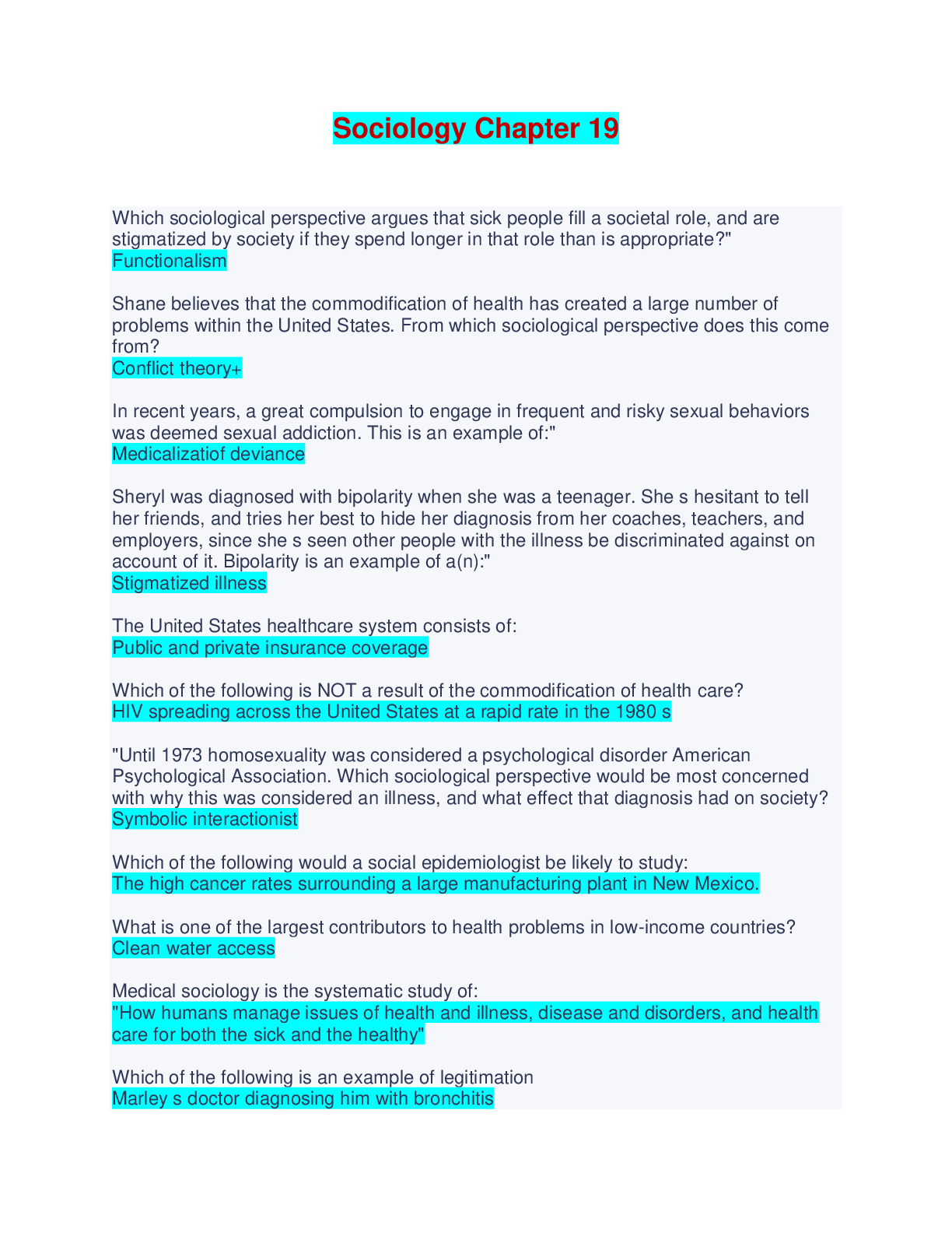 Sociology Chapter 19 - Questions and Answers Which sociological perspective argues that sick people fill a societal role, and are stigmatized by society if they spend longer in that role than is appr...