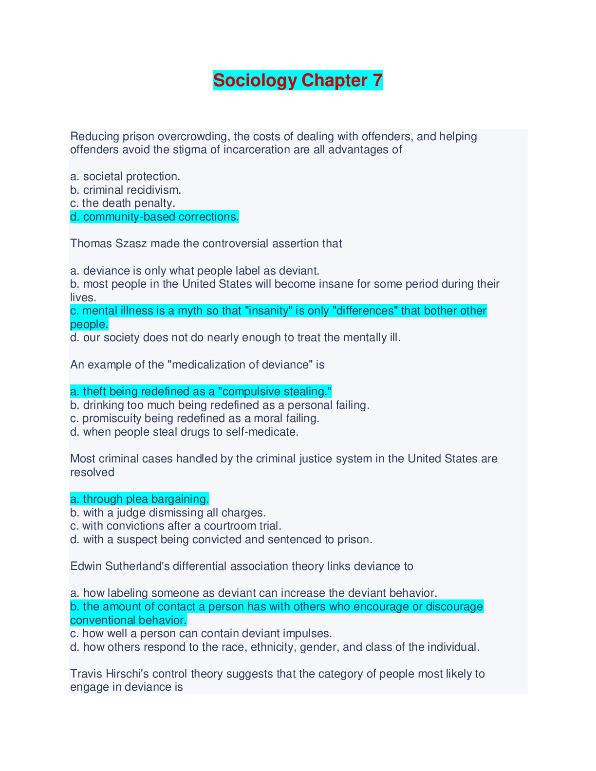 Sociology Chapter 7 - Questions and Answers Reducing prison overcrowding, the costs of dealing with offenders, and helping offenders avoid the stigma of incarceration are all advantages of a. societ...