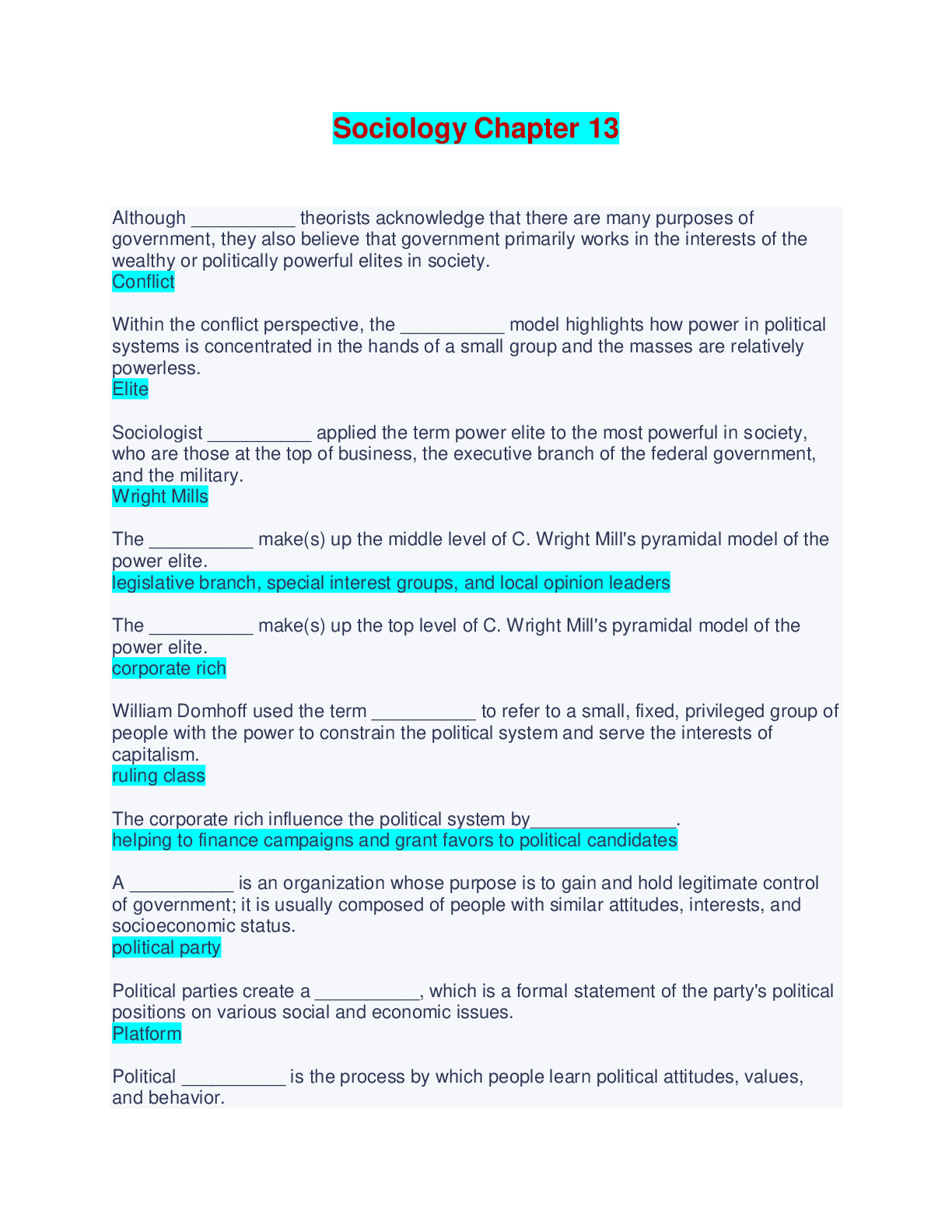 Sociology Chapter 13 - Questions and Answers Although __________ theorists acknowledge that there are many purposes of government, they also believe that government primarily works in the interests...