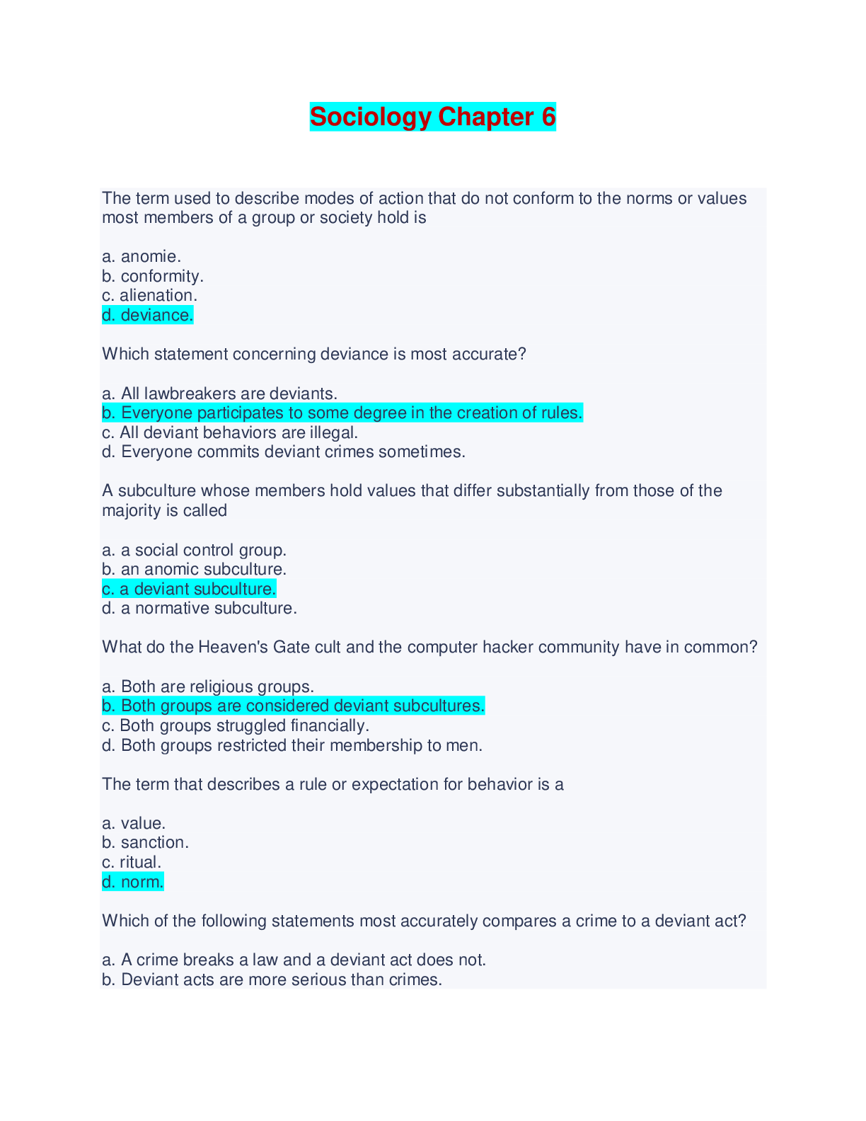 Sociology Chapter 6 - Questions and Answers The term used to describe modes of action that do not conform to the norms or values most members of a group or society hold is a. anomie. b. conformity....