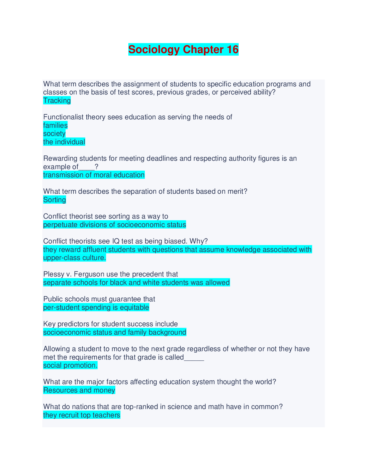 Sociology Chapter 16 - Questions and Answers What term describes the assignment of students to specific education programs and classes on the basis of test scores, previous grades, or perceived abili...