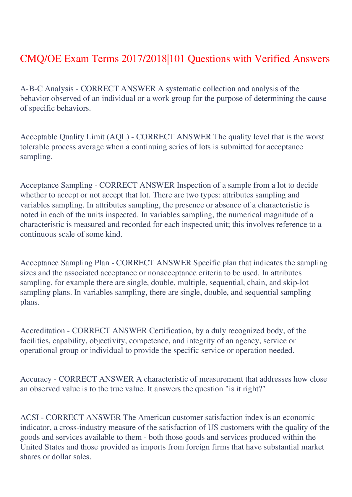 CMQ/OE Exam Terms 2017/2018|101 Questions with Verified Answers A-B-C Analysis - CORRECT ANSWER A systematic collection and analysis of the behavior observed of an individual or a work group for th...