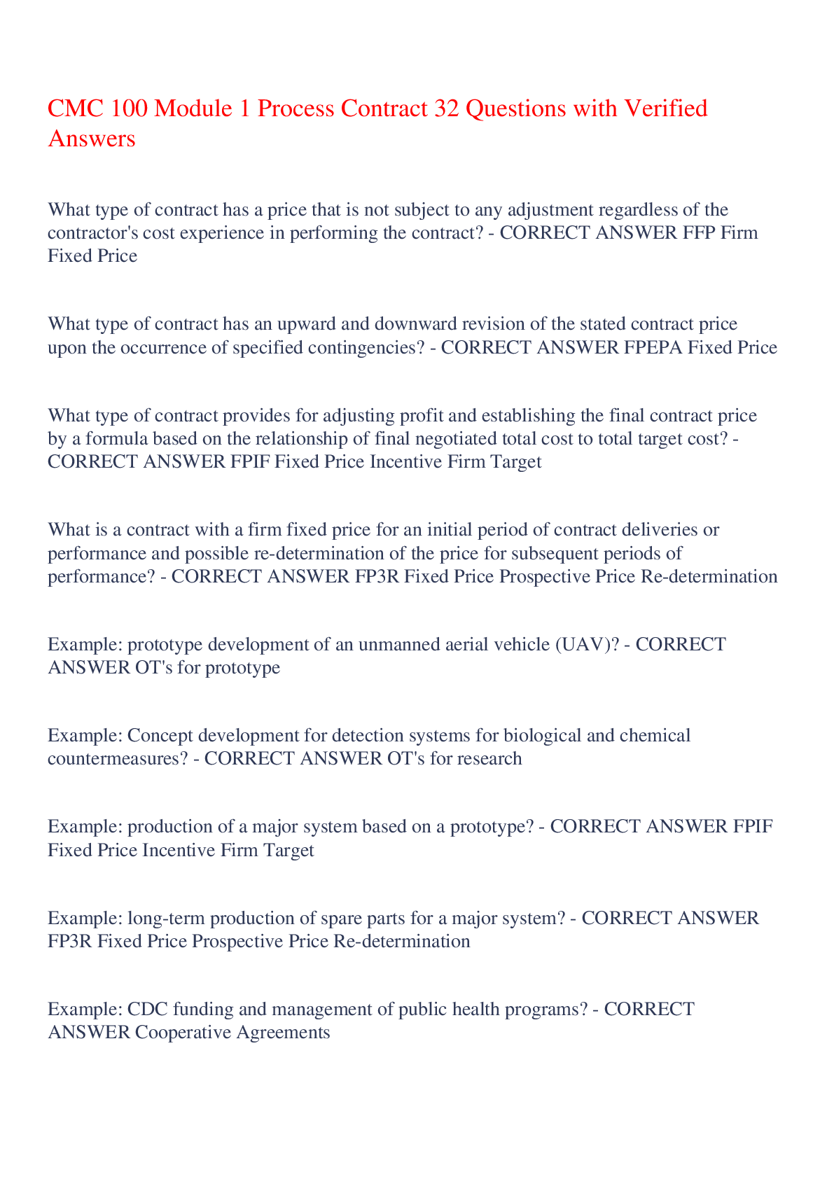 CMC 100 Module 1 Process Contract 32 Questions with Verified Answers What type of contract has a price that is not subject to any adjustment regardless of the contractor's cost experience in perfor...