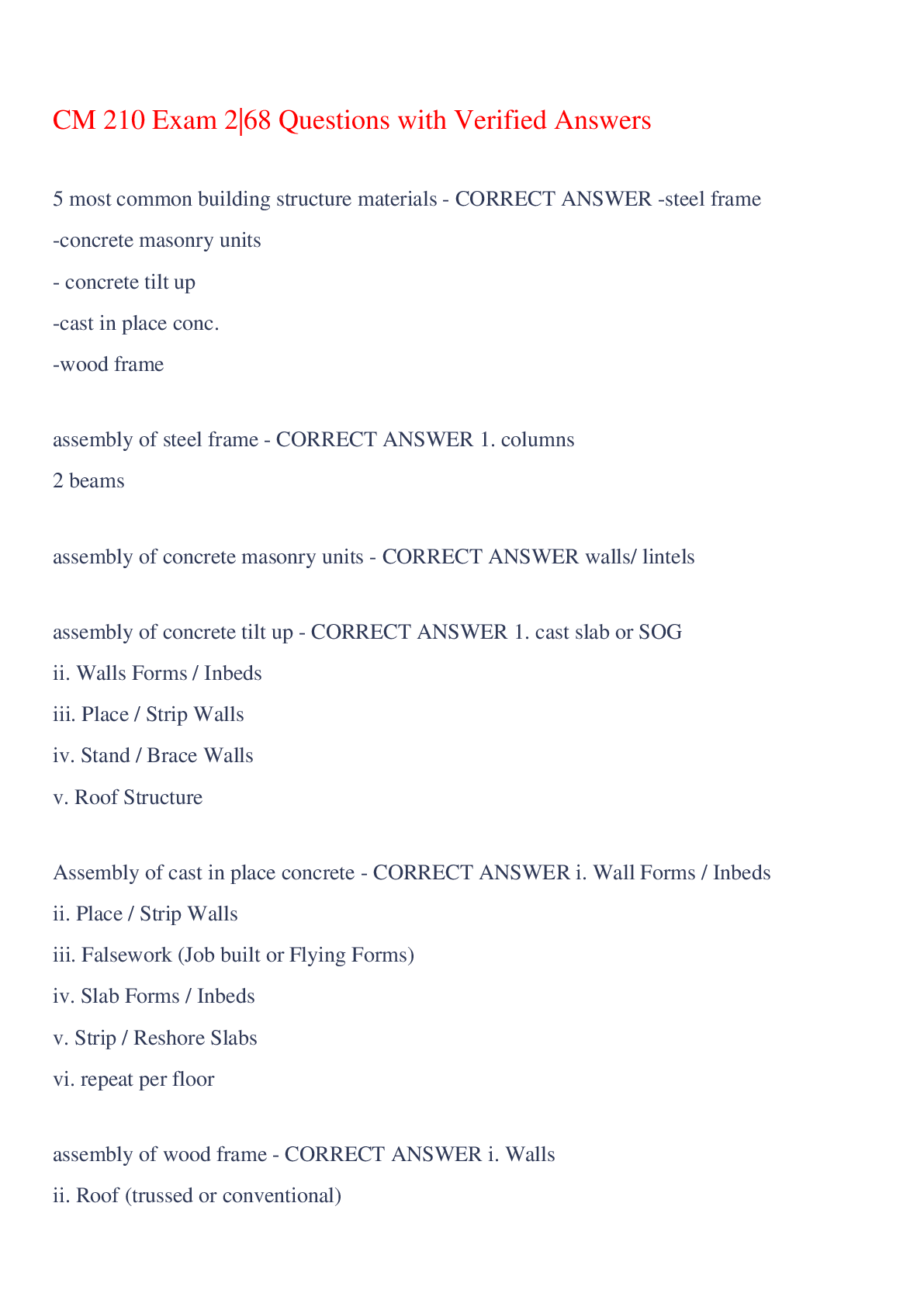 CM 210 Exam 2|68 Questions with Verified Answers 5 most common building structure materials - CORRECT ANSWER -steel frame -concrete masonry units - concrete tilt up -cast in place conc. -wood f...