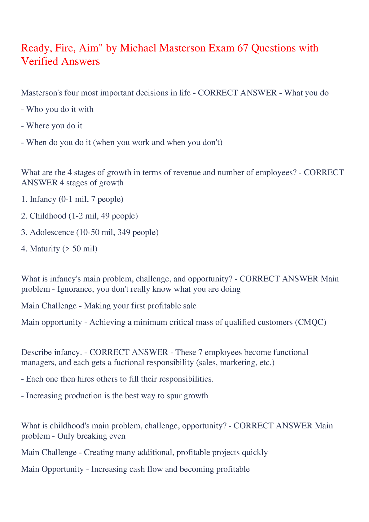 Ready, Fire, Aim" by Michael Masterson Exam 67 Questions with Verified Answers Masterson's four most important decisions in life - CORRECT ANSWER - What you do - Who you do it with - Where you do...