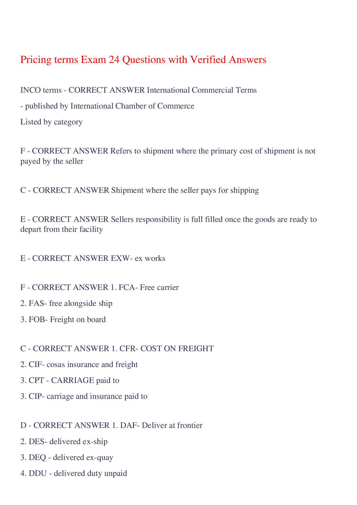 Pricing terms Exam 24 Questions with Verified Answers INCO terms - CORRECT ANSWER International Commercial Terms - published by International Chamber of Commerce Listed by category F - CORRECT...