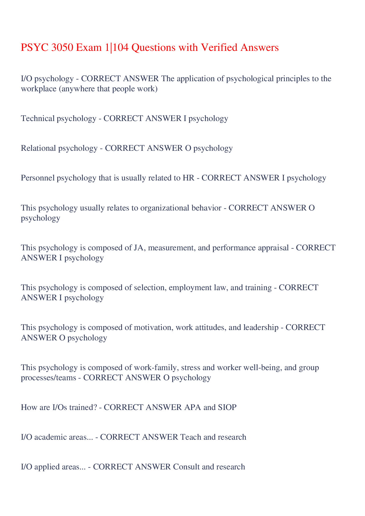 PSYC 3050 Exam 1|104 Questions with Verified Answers I/O psychology - CORRECT ANSWER The application of psychological principles to the workplace (anywhere that people work) Technical psychology...