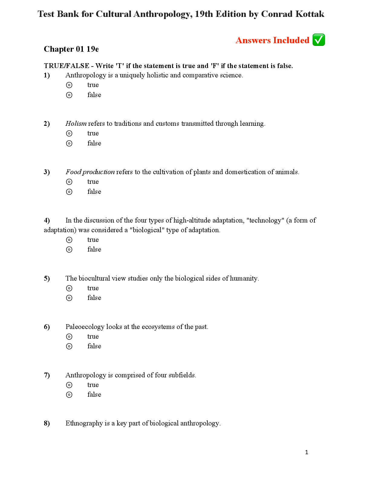 Anthropology > TEST BANKS > Cultural Anthropology Appreciating Cultural Diversity 19th Edition By Conrad Phillip Kottak TEST BANK (All)