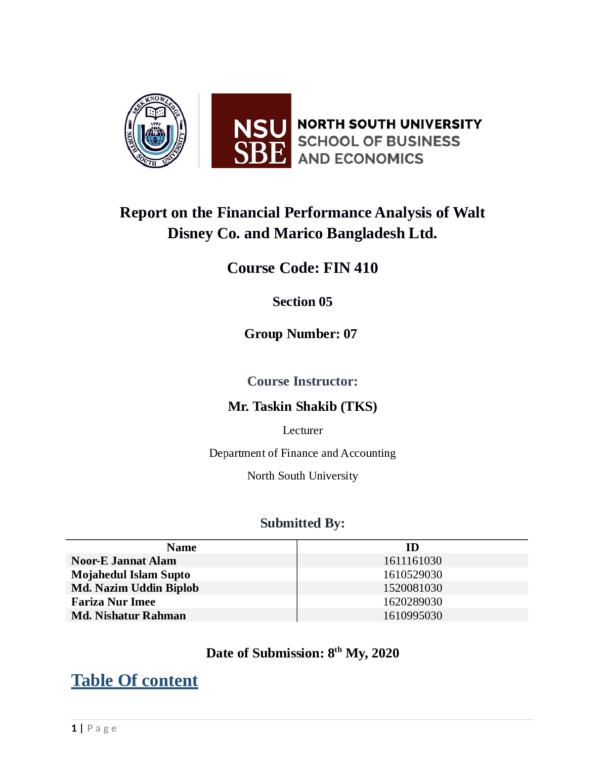 Finance > Research Paper > PROJECT REPORT > 410-project-TKS. North South University FIN 410. Report on the Financial Performance Analysis of Walt Disney Co. and Marico Bangladesh Ltd. Course Code: FIN 410 Section 05 (All)