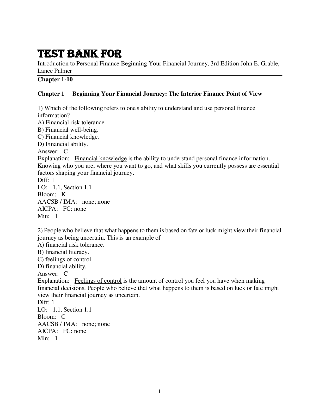 Finance > TEST BANKS > Test Bank For Introduction to Personal Finance Beginning Your Financial Journey, 3rd Edition John E. Grable, Lance Palmer Chapter 1-10 (All)