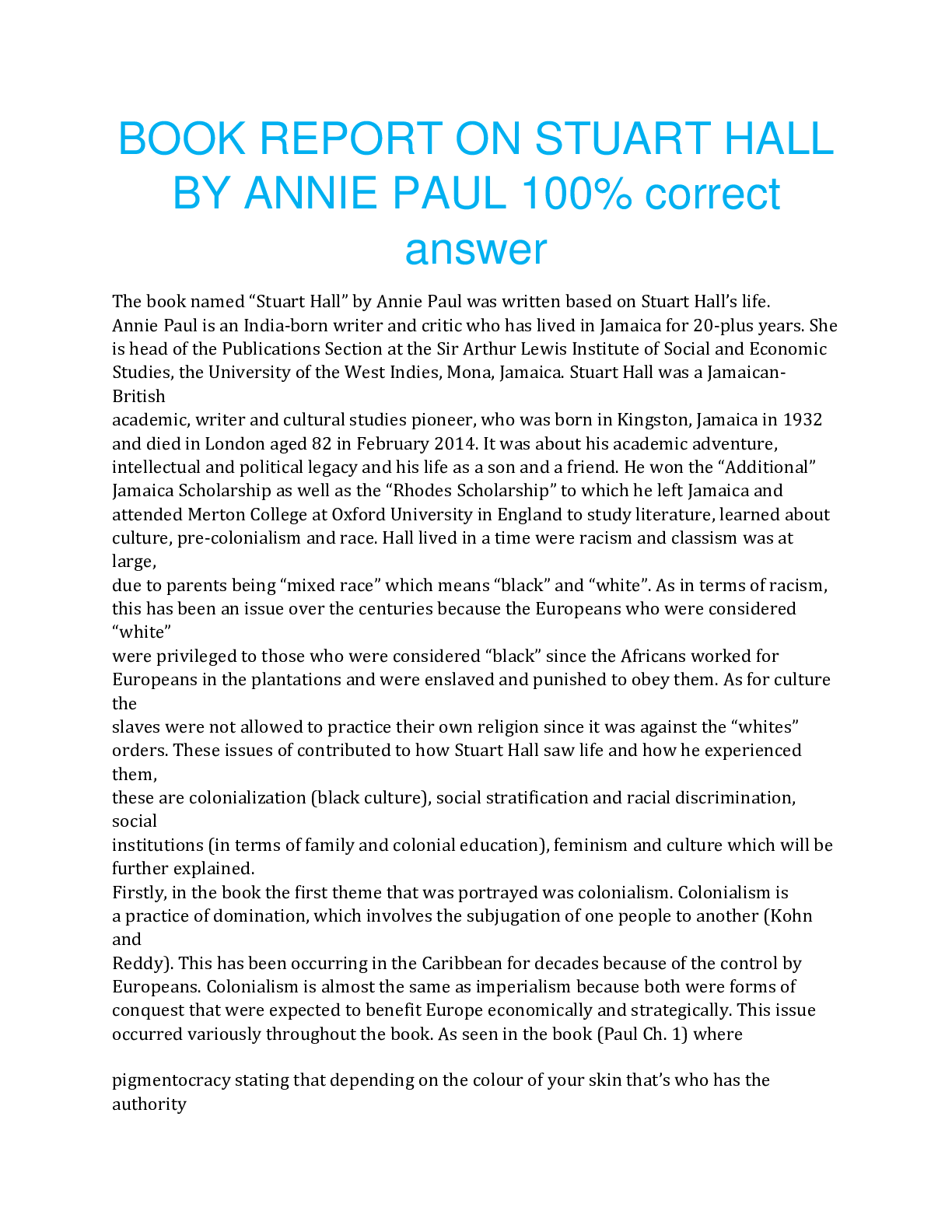 Finance > ESSAY > BOOK REPORT ON STUART HALL BY ANNIE PAUL 100% correct answer (All)