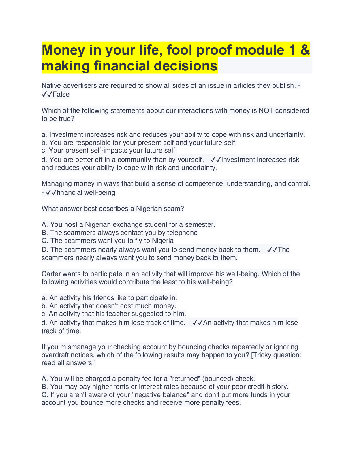 Finance > EXAM > Money in your life, fool proof module 1 & making financial decisions | 100% Correct Answers (All)