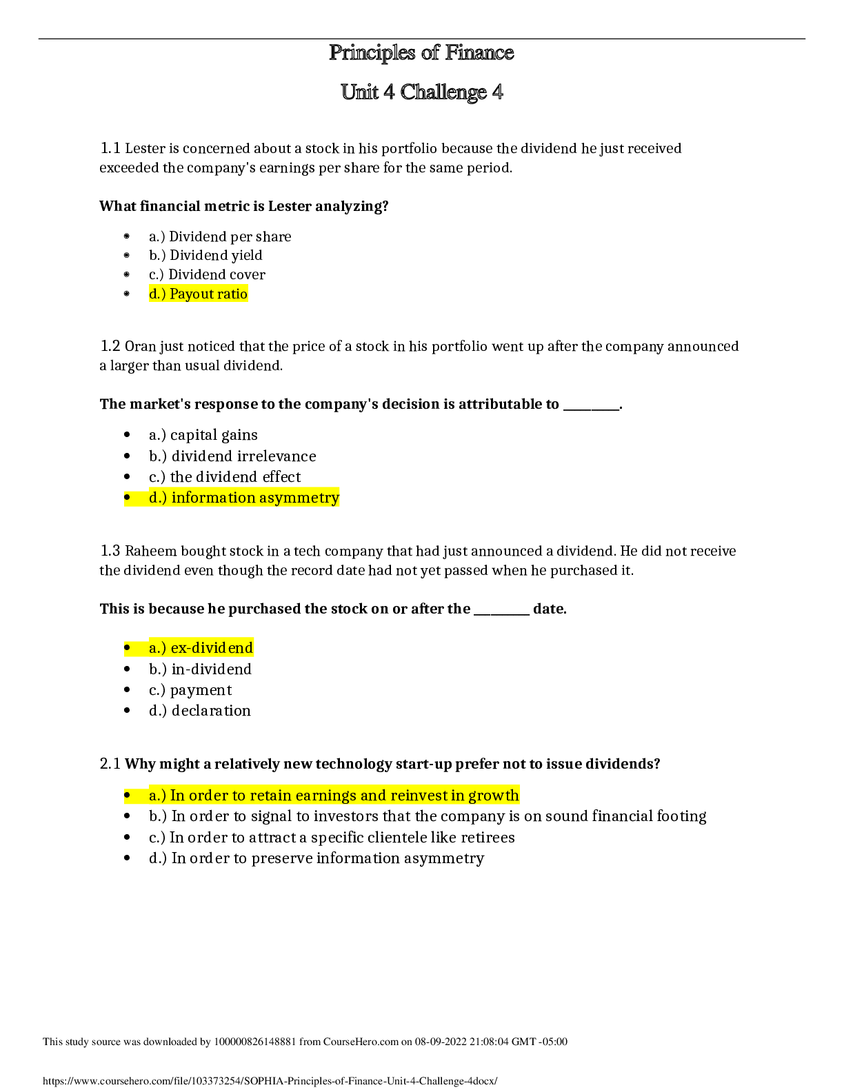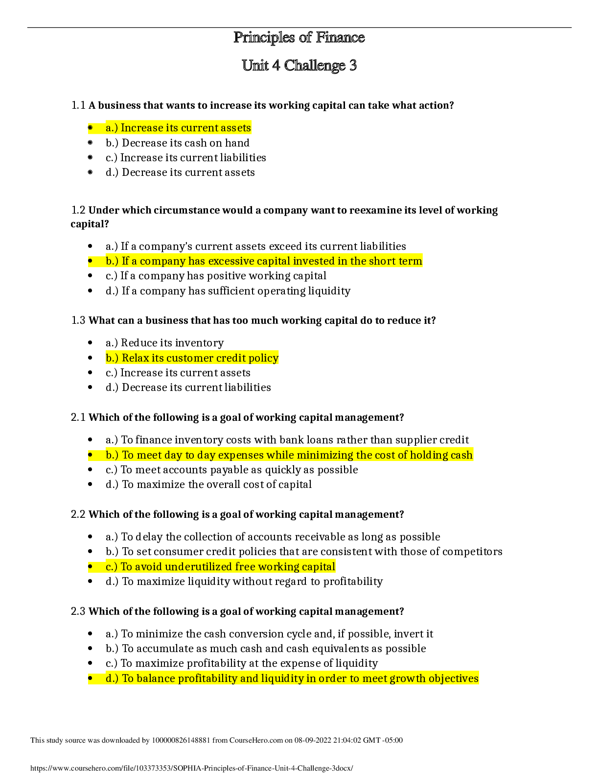 Finance > EXAM > FIN 320 SOPHIA Principles of Finance Unit 4 Challenge 3. All Correct Answers (All)