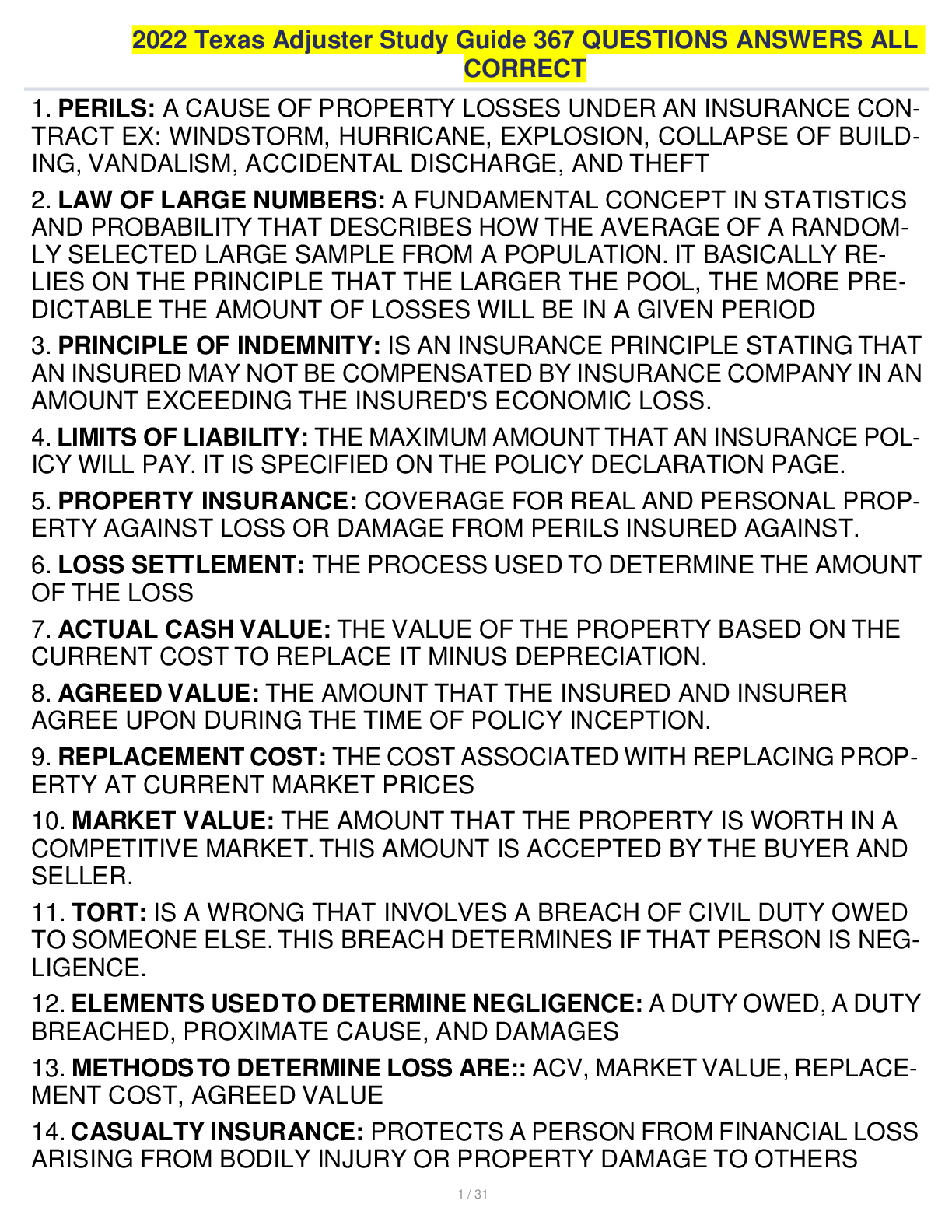 Finance > QUESTIONS & ANSWERS > 2022 Texas Adjuster Study Guide| 367 QUESTIONS| ANSWERS ALL CORRECT (All)
