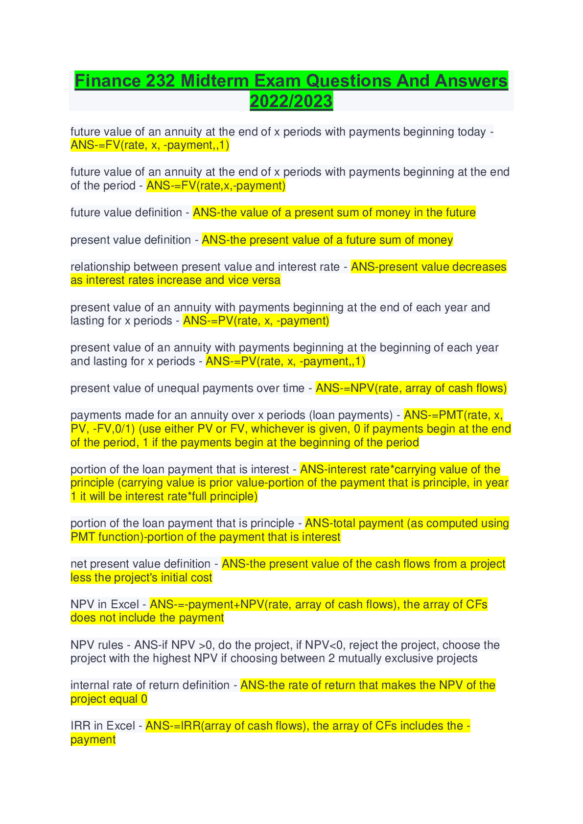 Finance > QUESTIONS & ANSWERS > Finance 232 Midterm Exam Questions And Answers 2022/2023 (All)