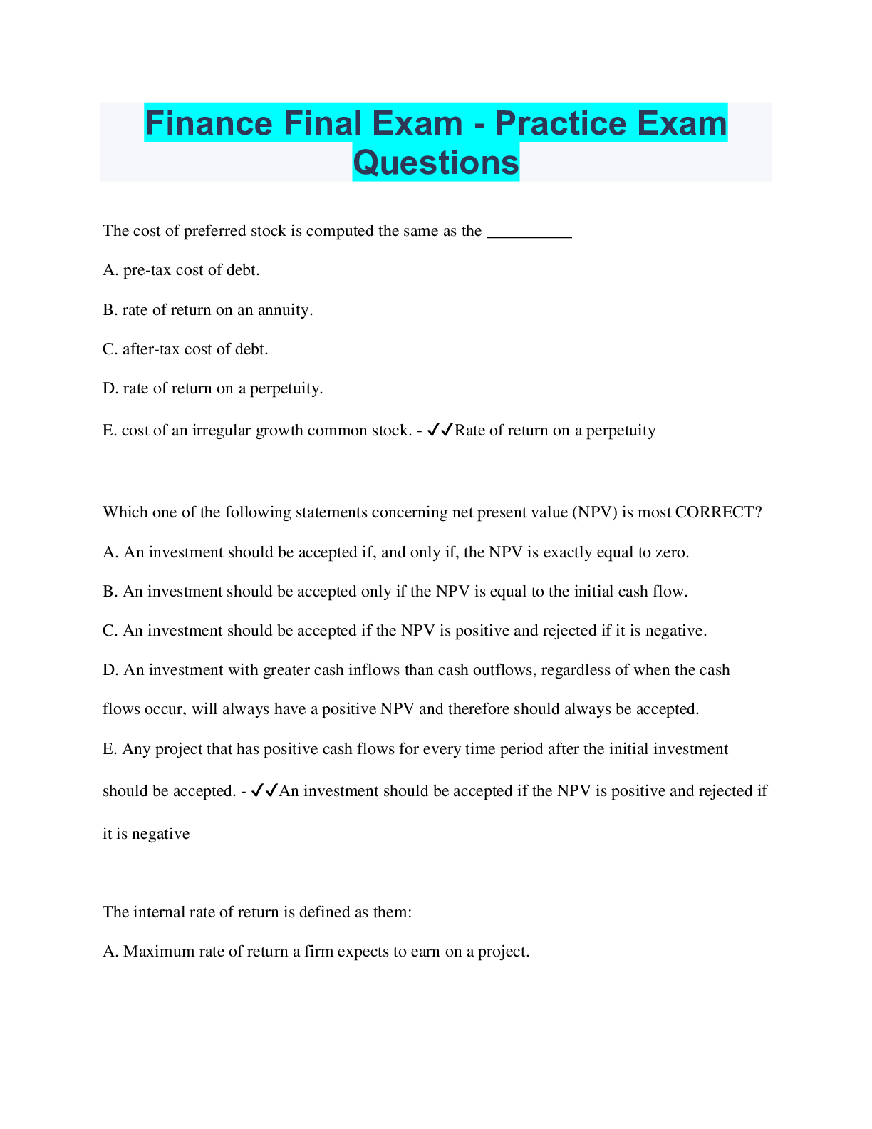 Finance > EXAMs > Finance Final Exam - Practice Exam Questions | 50 Questions with 100% Correct Answers | Verified (All)