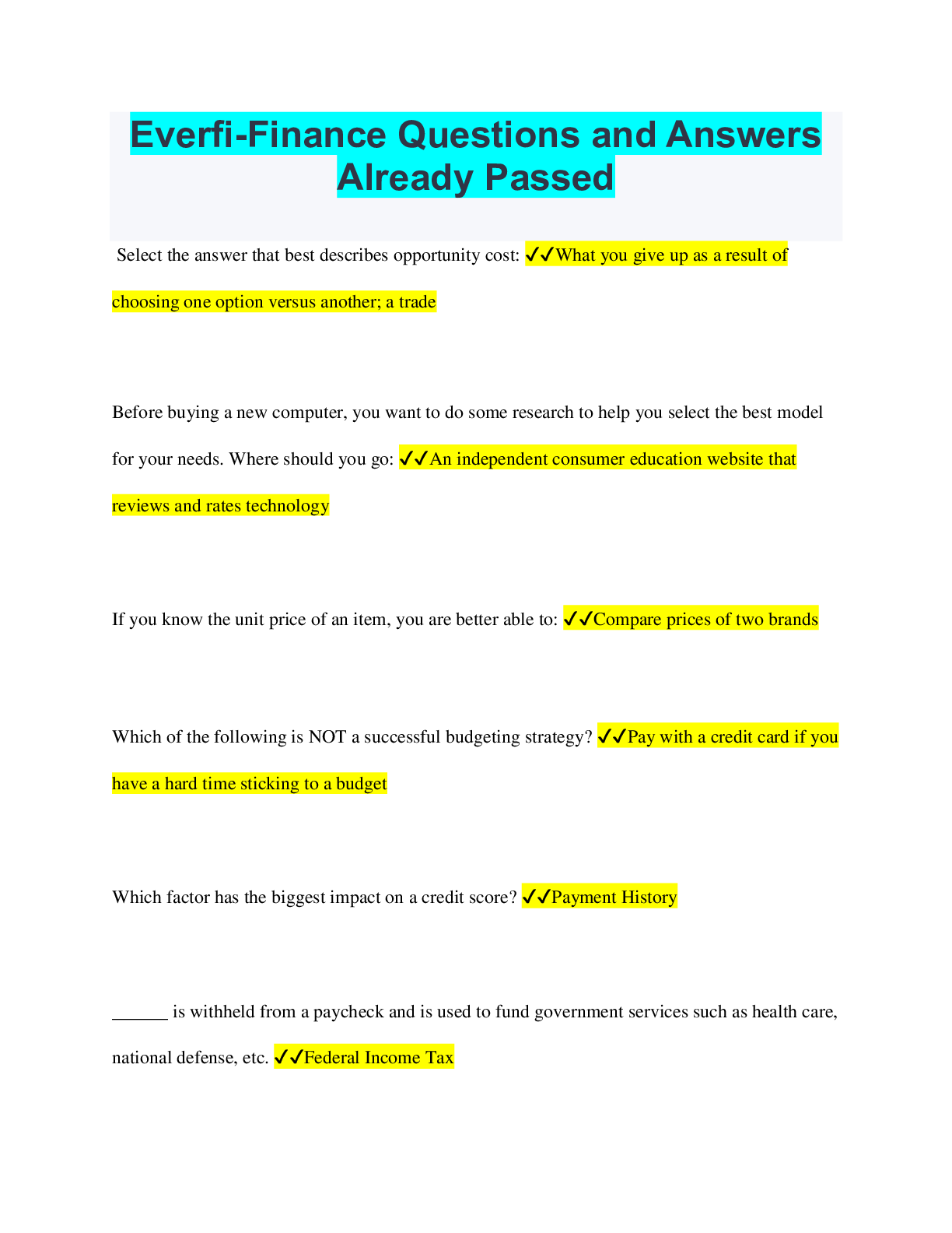 Finance > QUESTIONS & ANSWERS > Everfi-Finance Questions and Answers Already Passed (All)
