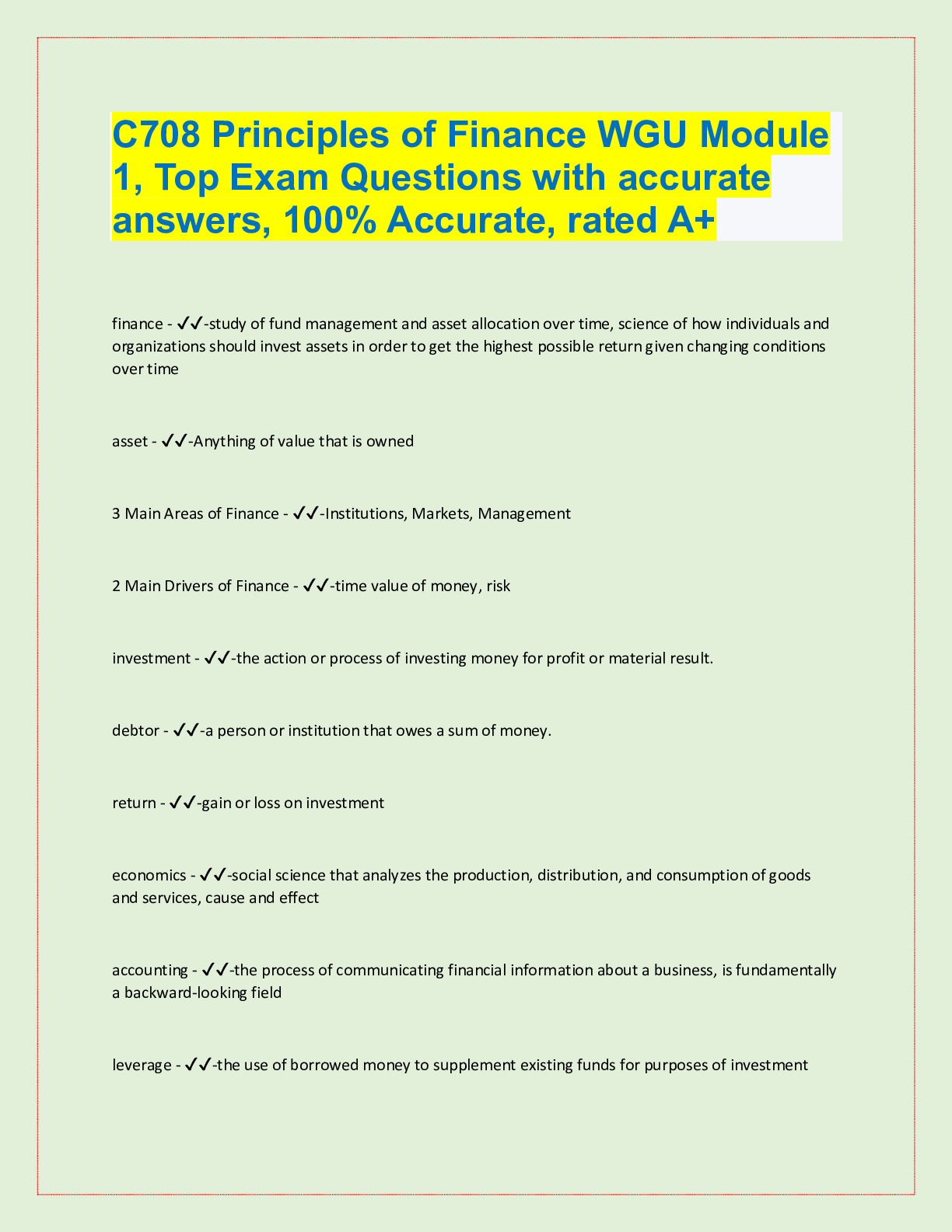 Finance > QUESTIONS & ANSWERS > C708 Principles of Finance WGU Module 1, Top Exam Questions with accurate answers, 100% Accurate, rated A+ (All)