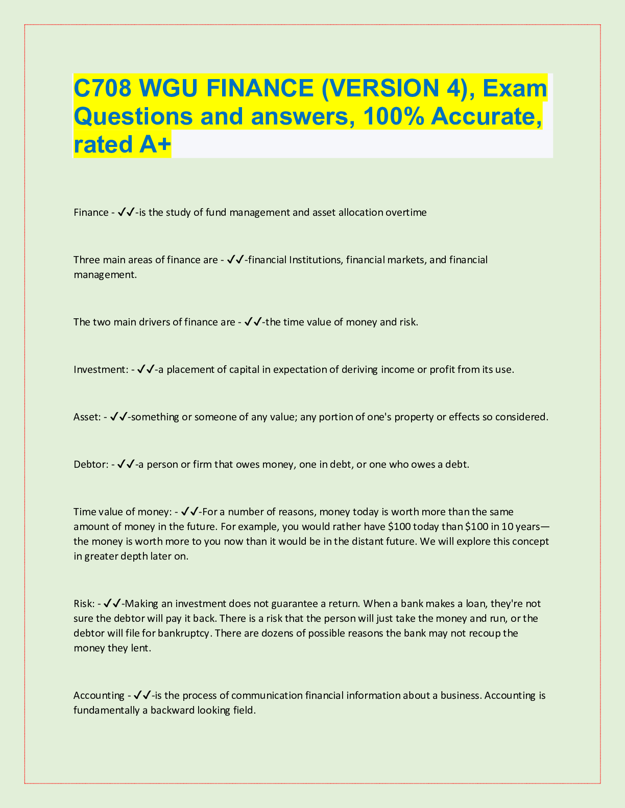 Finance > QUESTIONS & ANSWERS > C708 WGU FINANCE (VERSION 4), Exam Questions and answers, 100% Accurate, rated A+ (All)