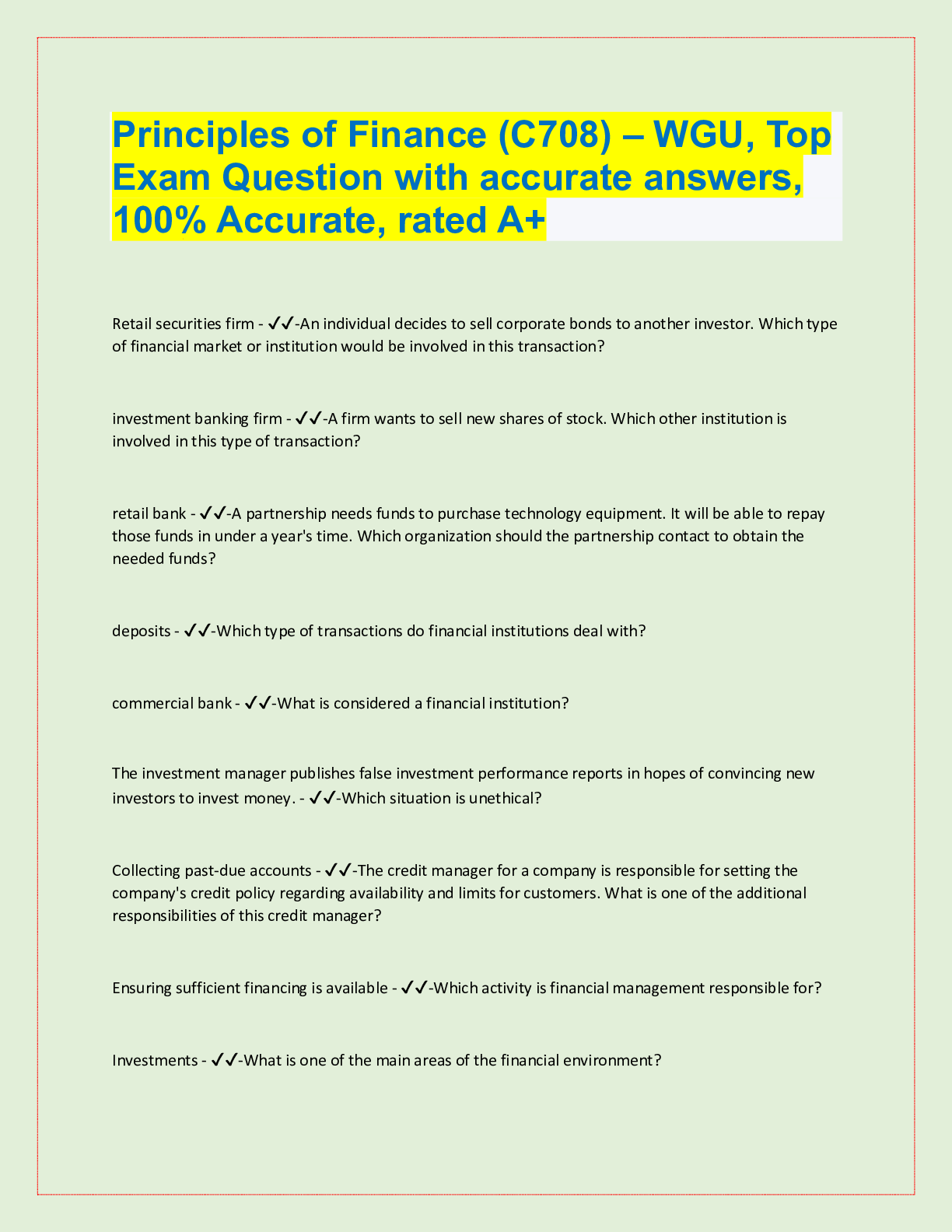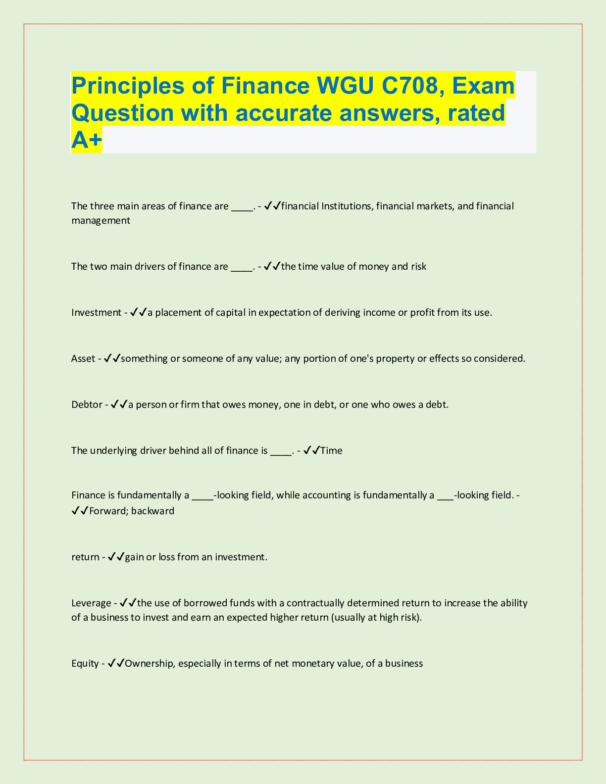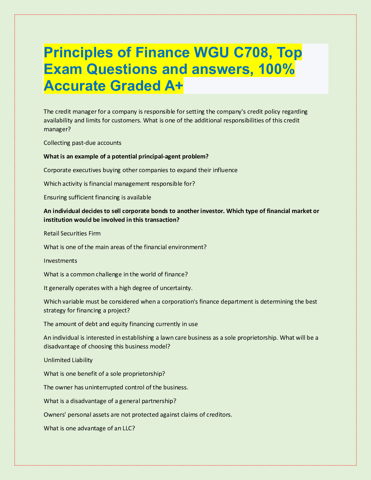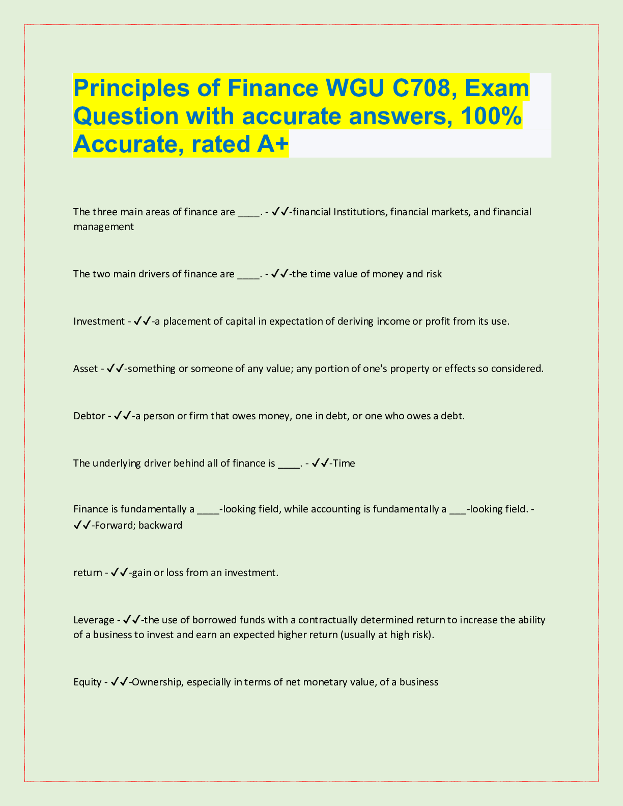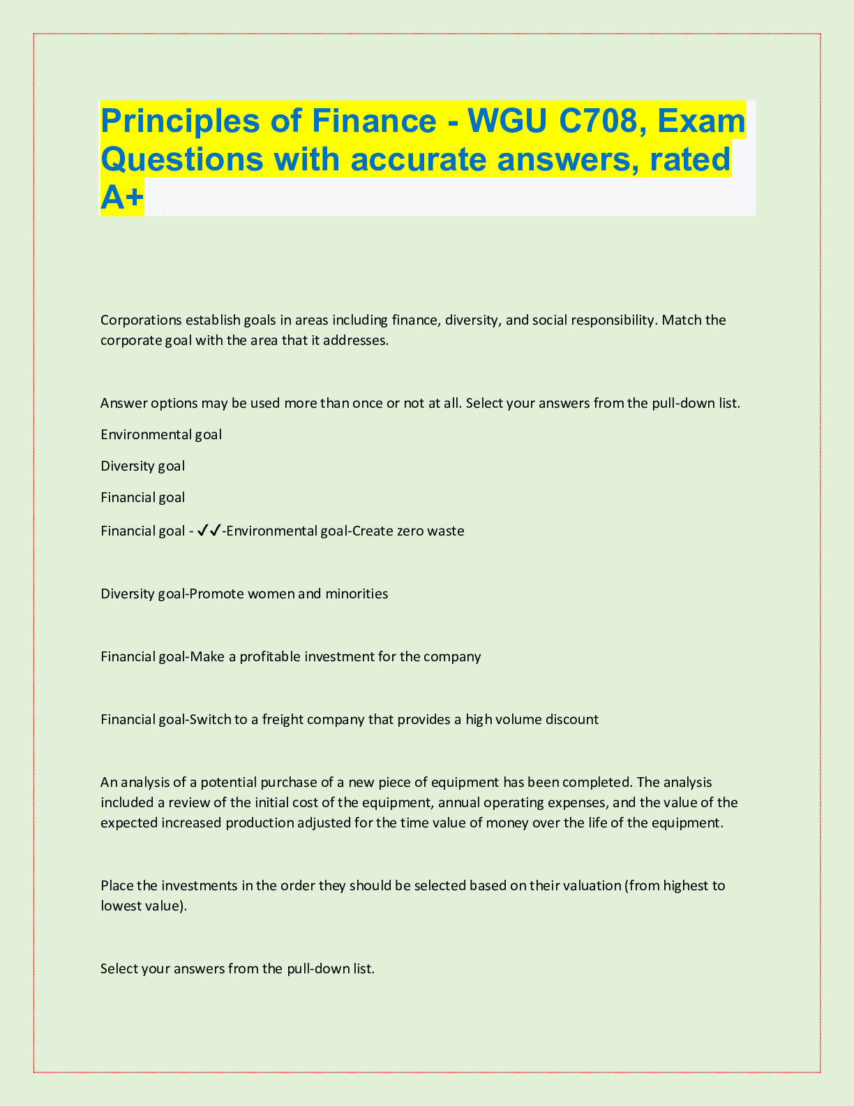 Finance > QUESTIONS & ANSWERS > Principles of Finance C708 V4-UG WGU, Top Exam Preview sections, rated A+ (All)