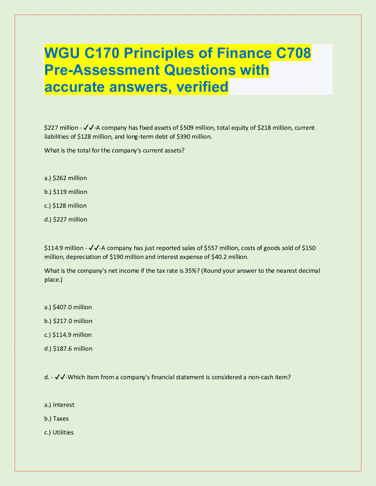 Finance > QUESTIONS & ANSWERS > WGU C170 Principles of Finance C708 Pre-Assessment Questions with accurate answers, verified (All)