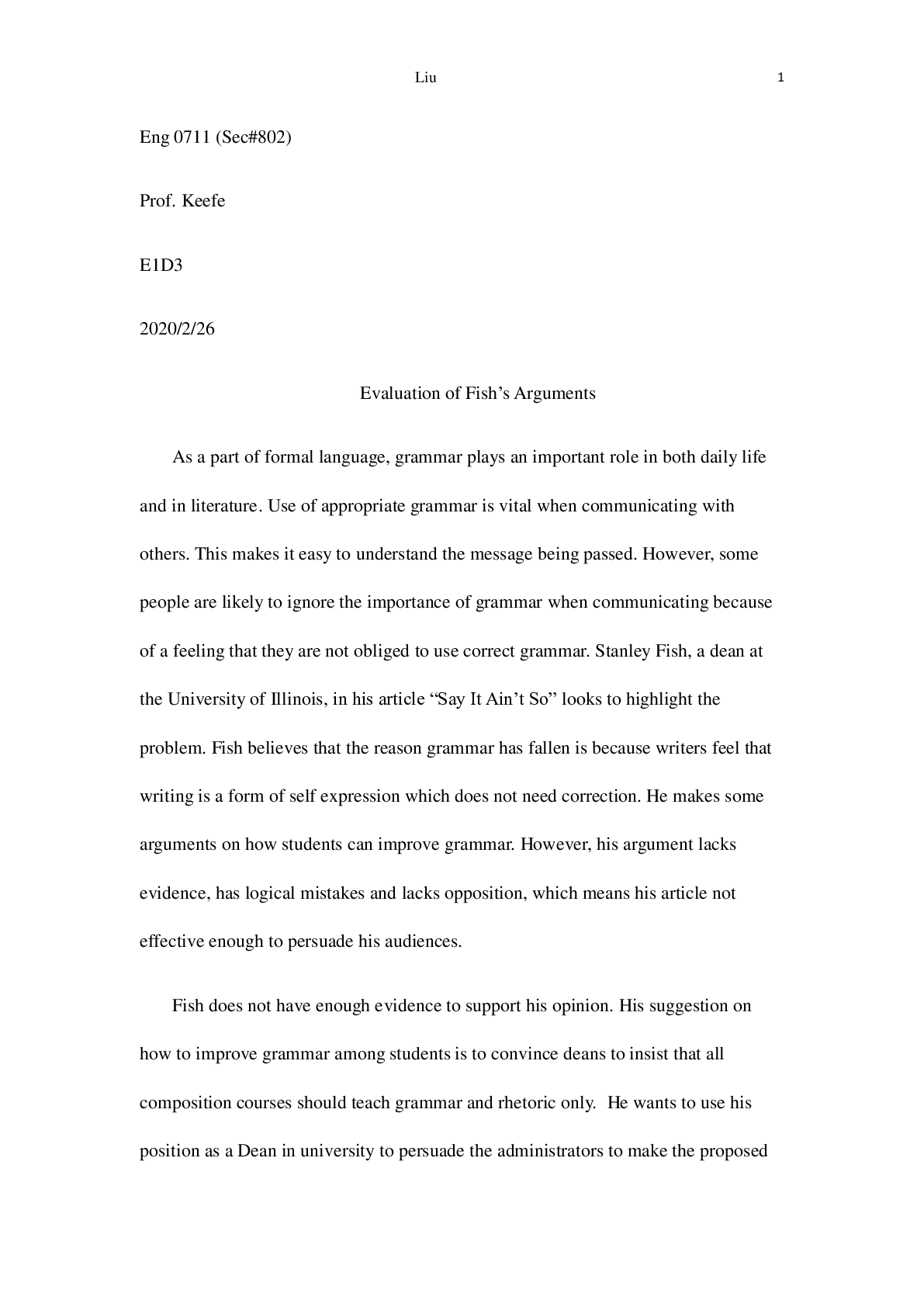 English 106 > ESSAY > Evaluation of Fish’s Arguments (All)