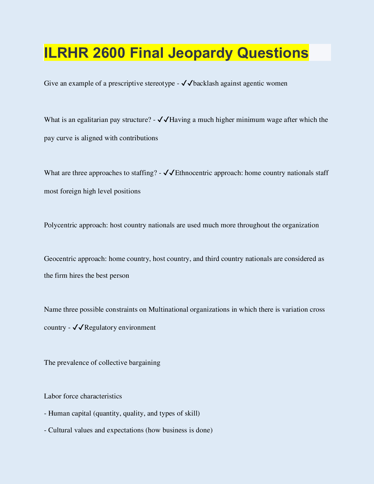 Human Resource Management > QUESTIONS & ANSWERS > ILRHR 2600 Final Jeopardy Questions (All)